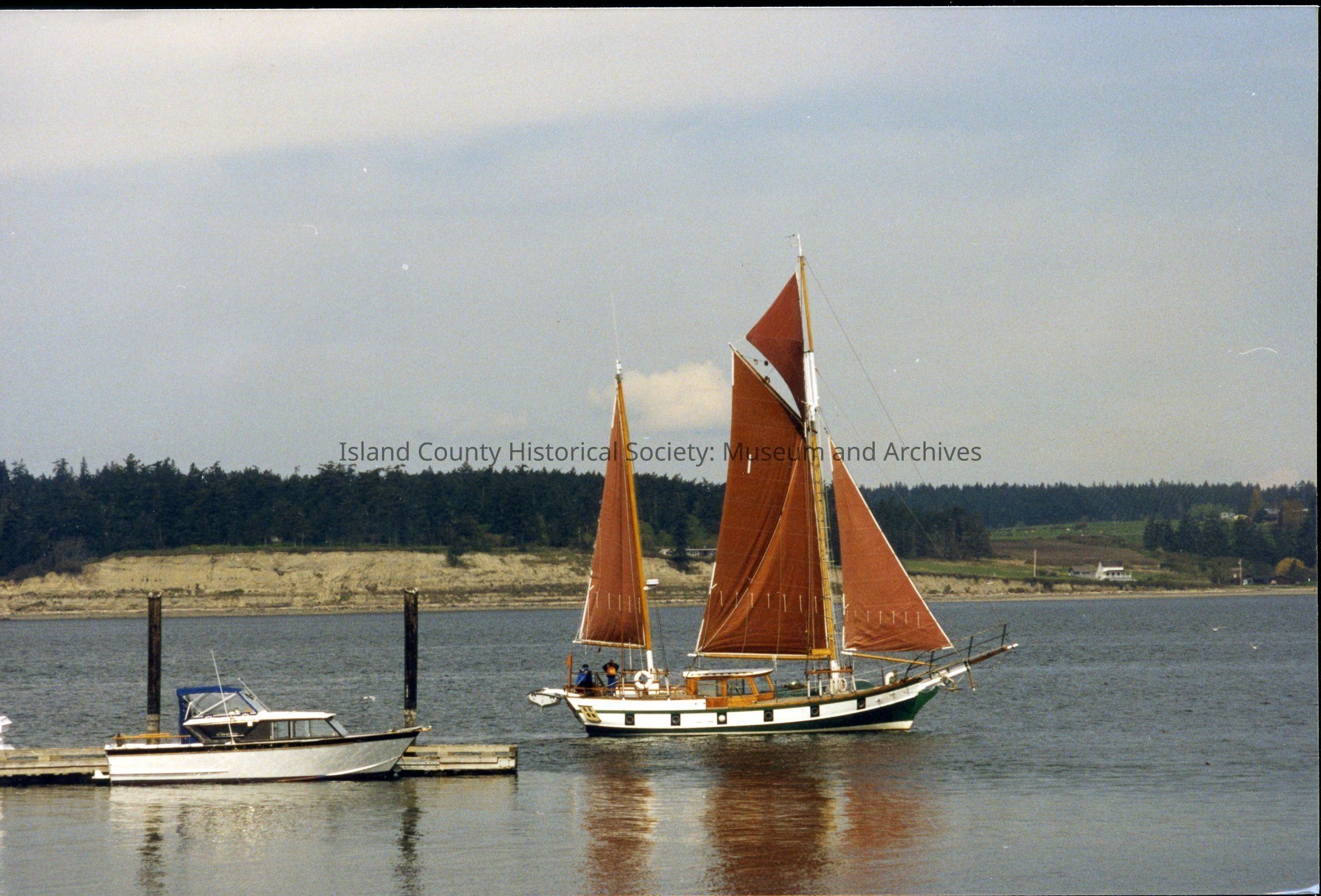 Sailing vessel off the Coupeville Wharf, c. 1997-1998. Smaller boat to the left.Photograph Details