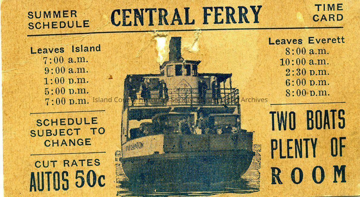 Central Ferry Summer Schedule Time Card. Year unknown. On card. Black and white photo in the centre. Gives times of when the ferry leaves the island and leaves Everett. Gives car rate. Two small holes in the upper centre of the card.
