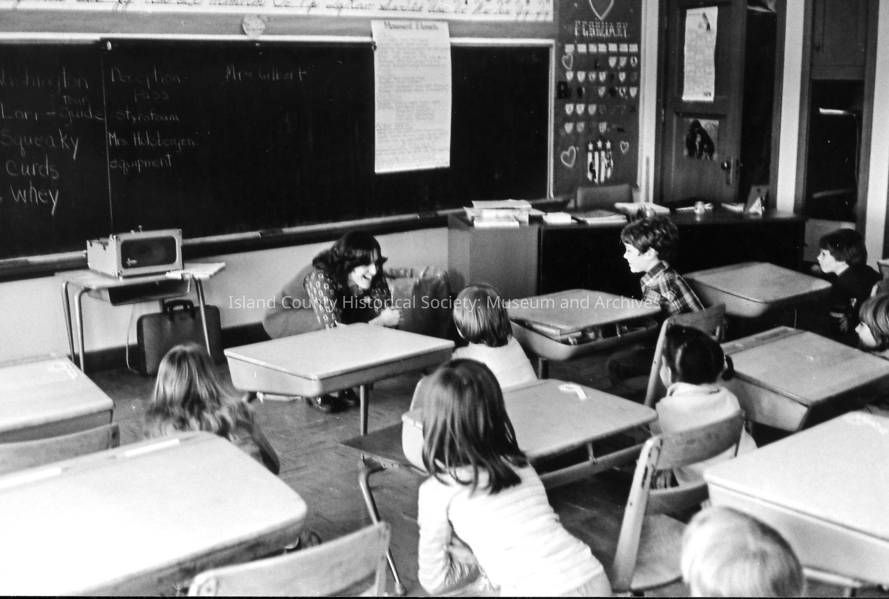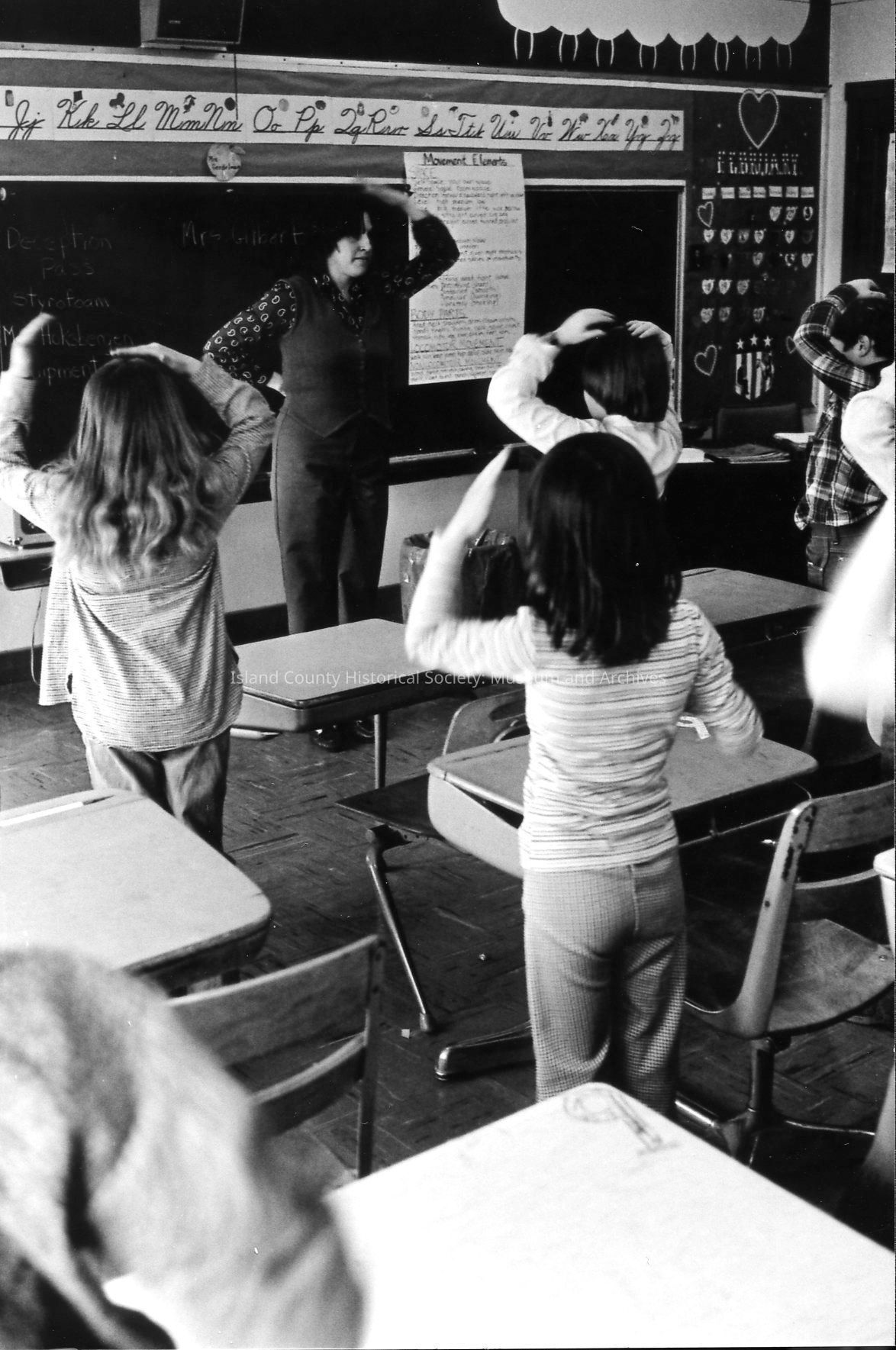 Students stand beside their desks while a teacher at the front of the class leads them in excercises. A poster titled "Movement Elements" hangs near the blackboard. Cursive alphabet letters are posted above and a February calendar is near the door.Photograph Details