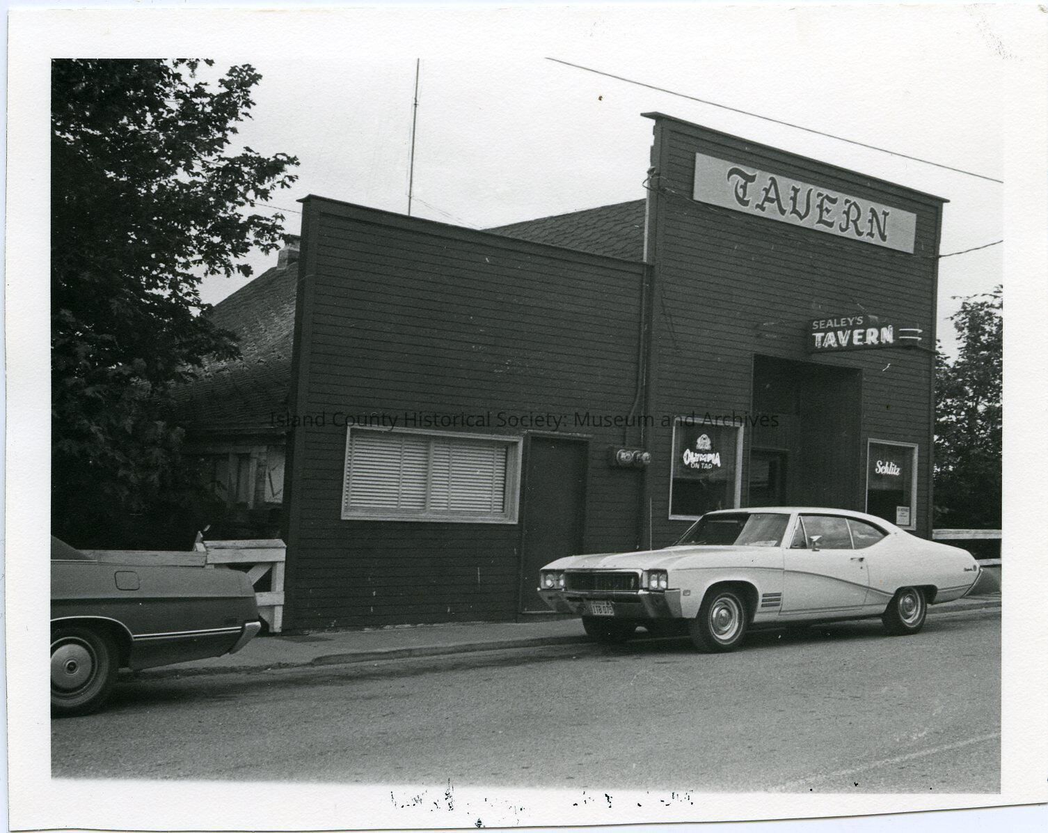 Photo of 8 NW Front Street with a sign along the top of the false front: Tavern, an another sign: Sealey's Tavern. A white/light two-door car is in front. Whidbey Mercantile, A. B. Coates and Co., Coupeville Grocery Store, Cash and Carry, Sealey's Tavern, Toby's Tavern. On the back: page 100 1 of 3. 127B. Tavern c. 1890. Sealeys tavern 1971. Coates Store c. 1890. Photo 1971.
