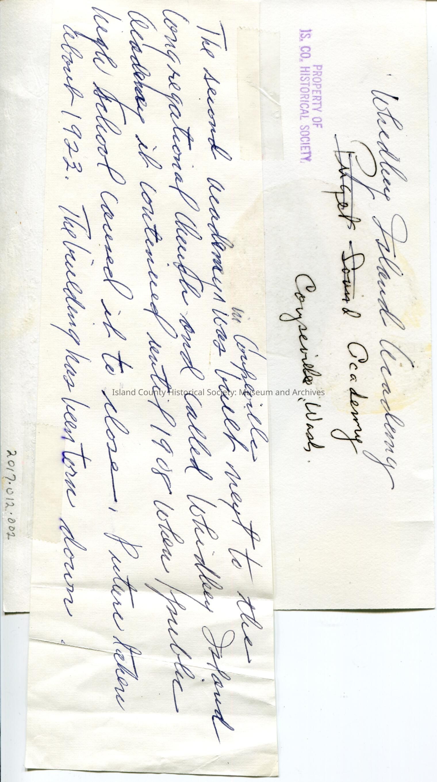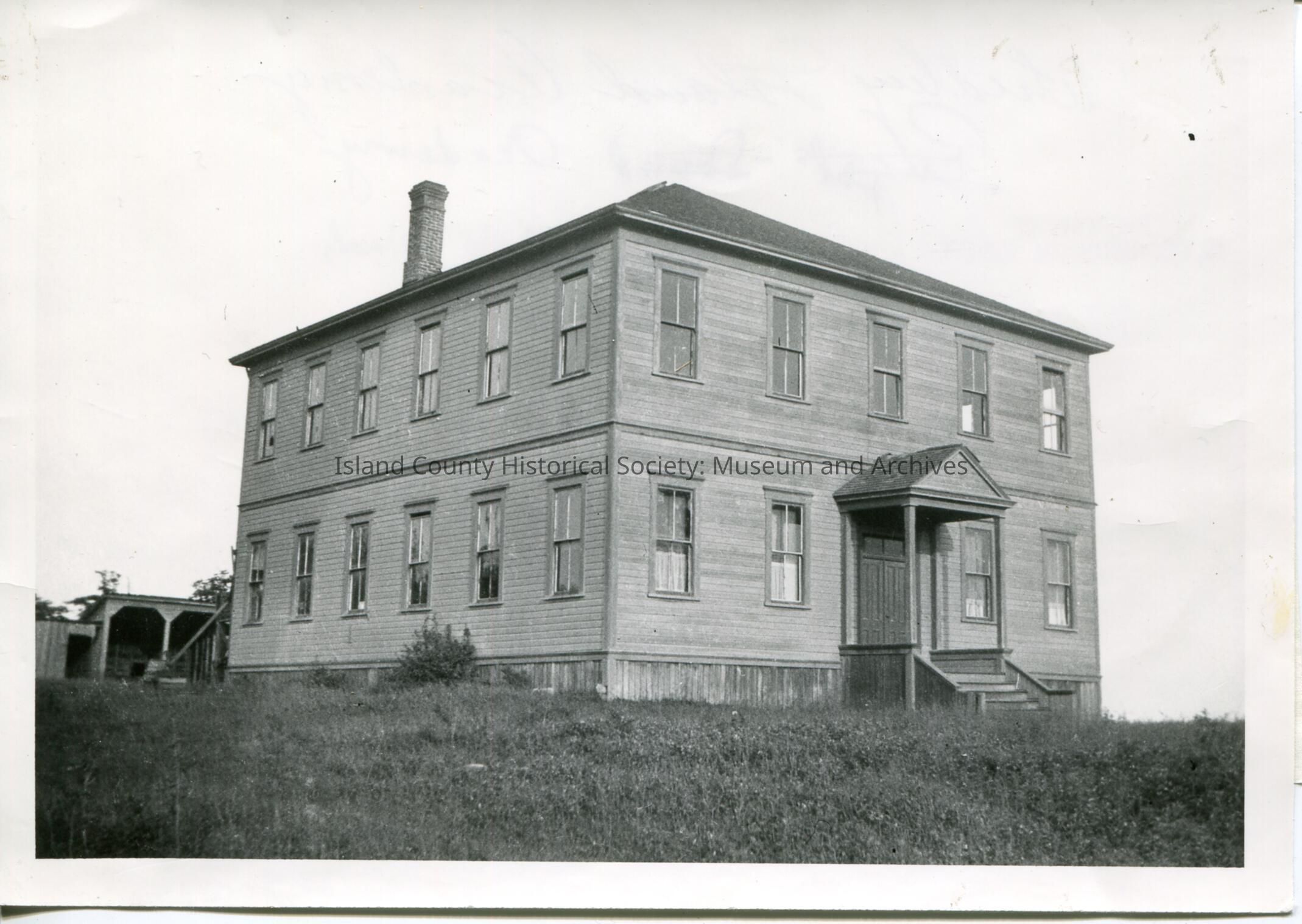 The 2nd Whidbey Academy with small outbuildings on the left side of the photo.Written on the back" Whidbey Island Academy Coupeville Was. The second academy in Coupeville was built next to the Congregational Church and called Whidbey Island Academy it continued until 1908 when public high school caused it to close. Picture taken about 1923. The building has been torn down