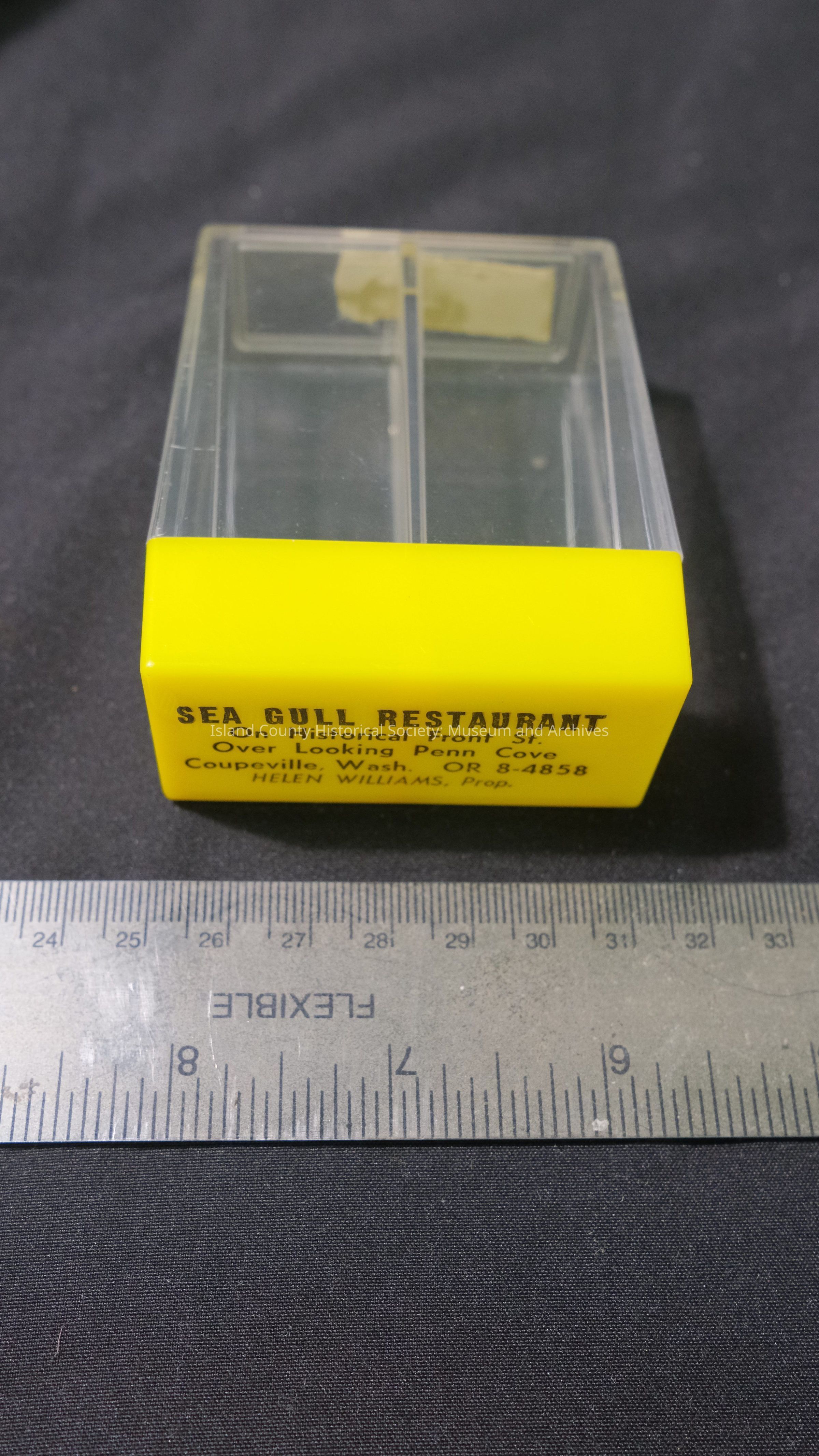 One yellow plastic salt and pepper shaker set with "Seagull Restaurant" logo.