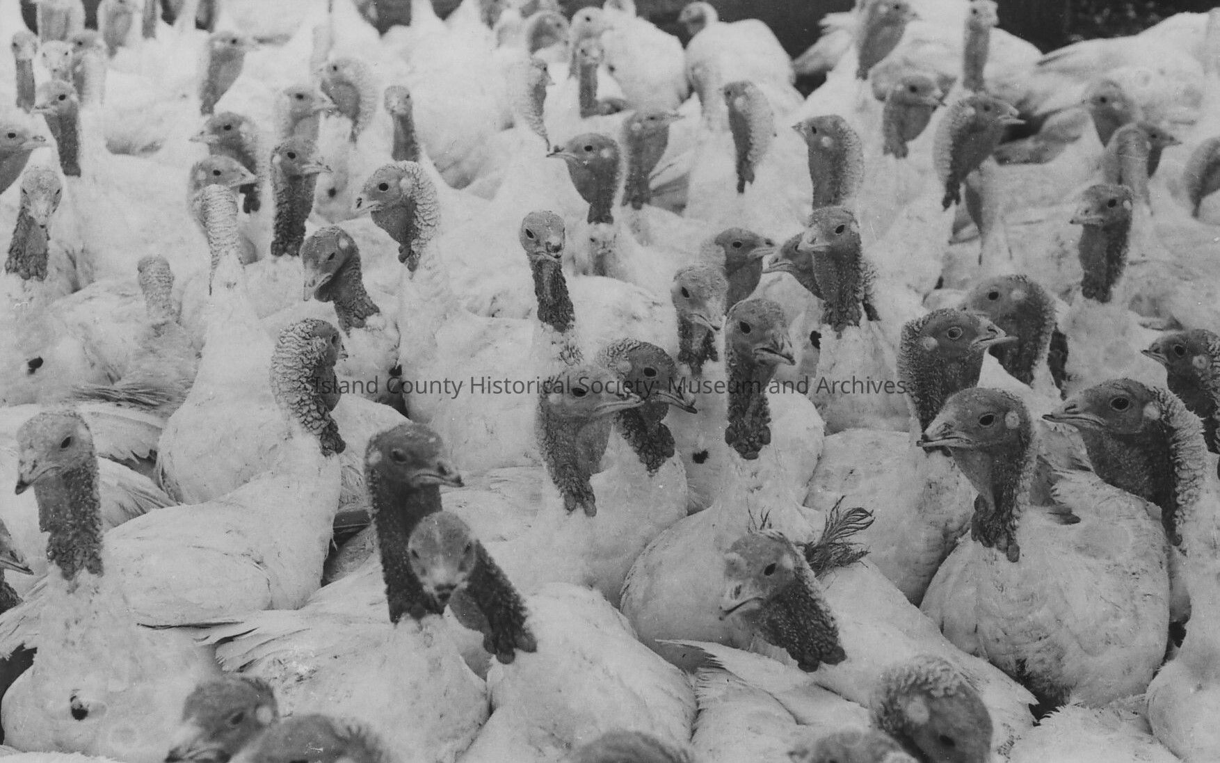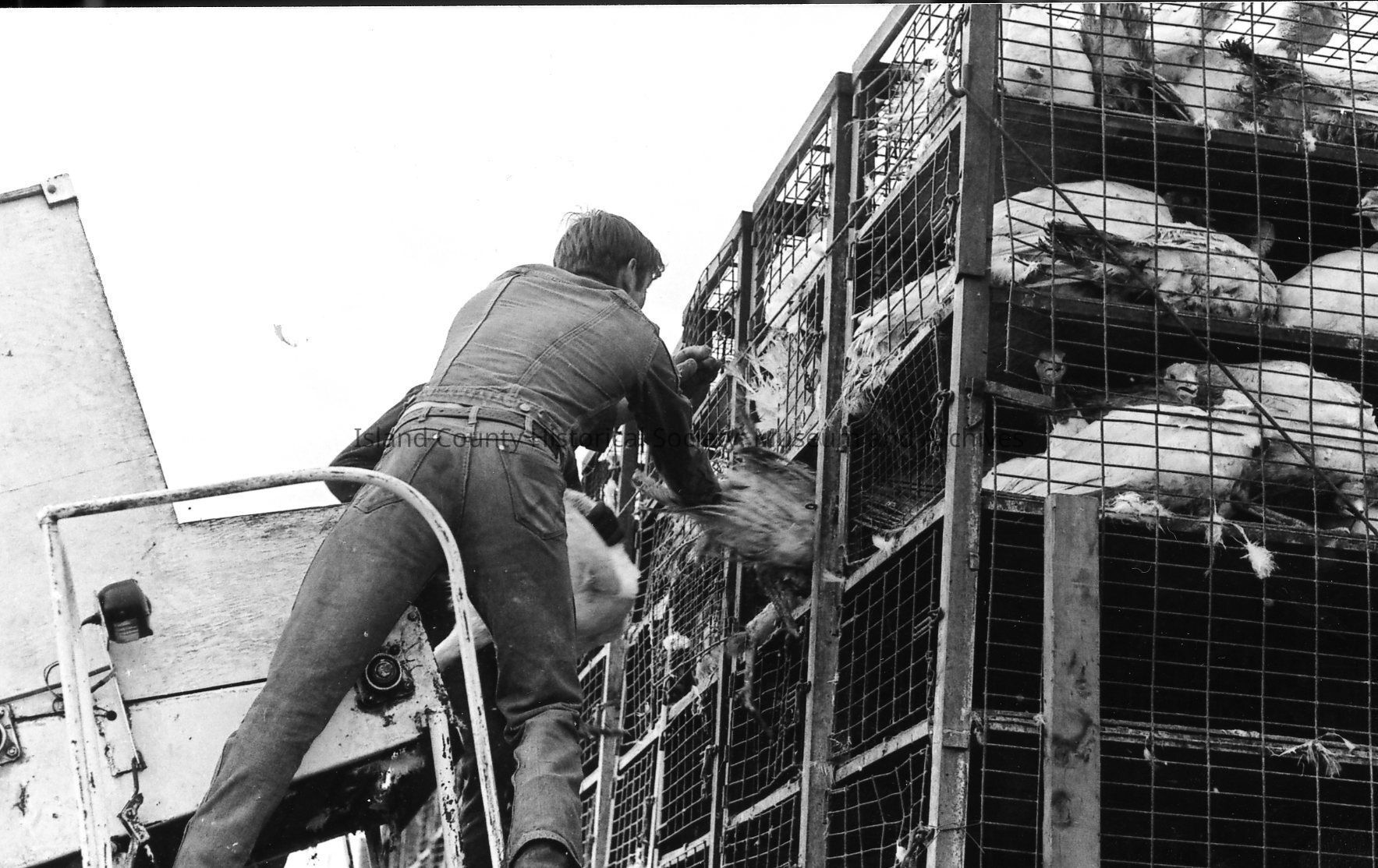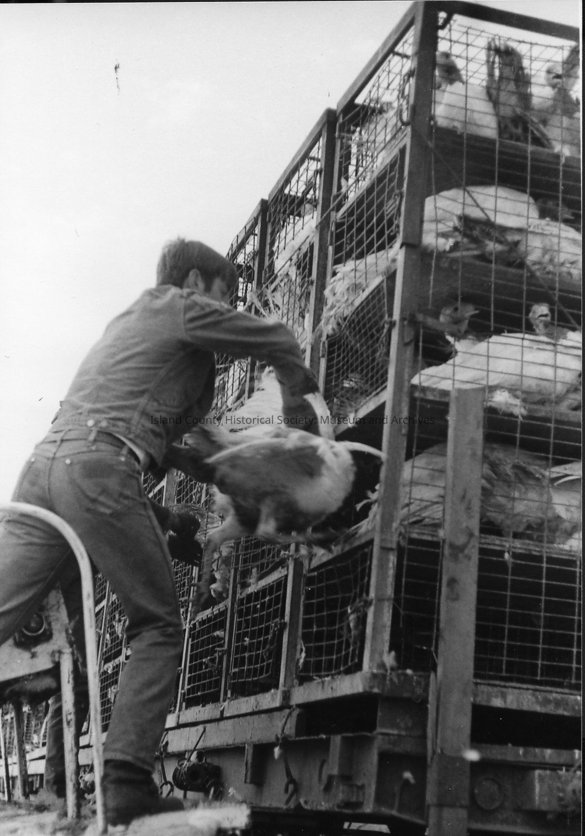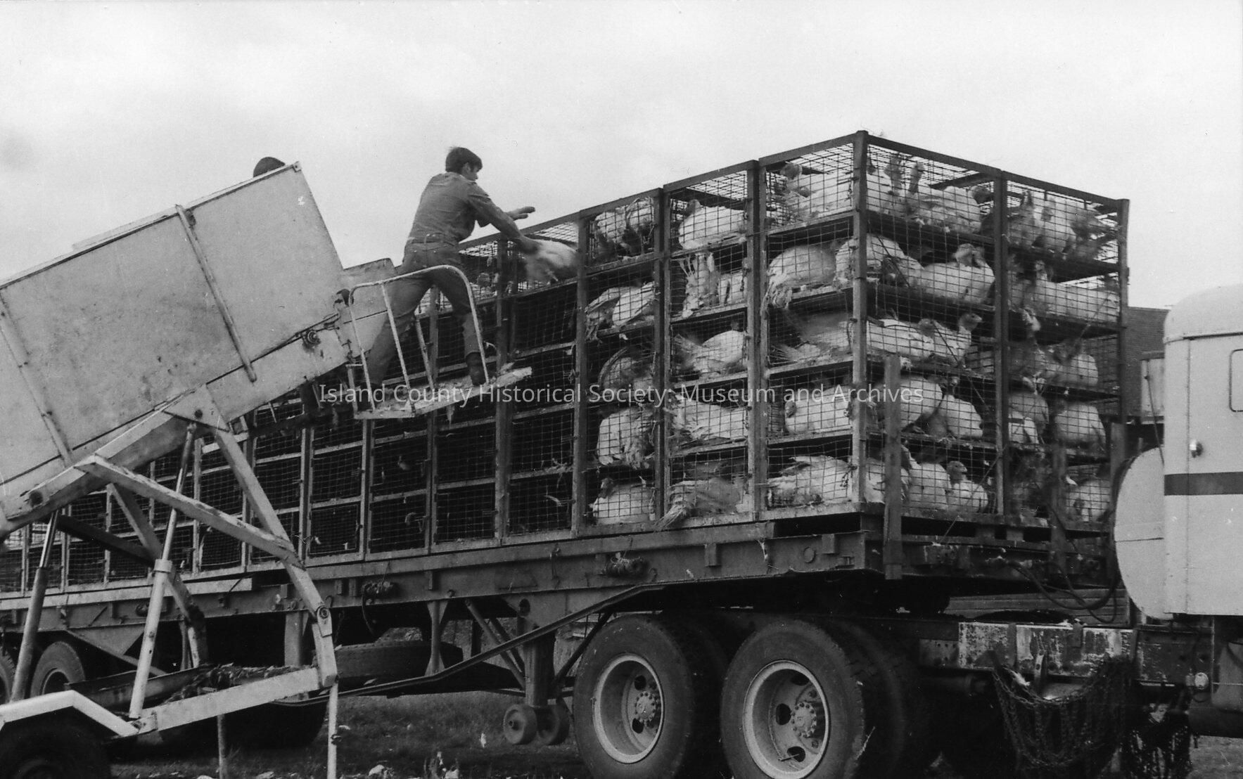 Worker loads turkeys from conveyer to cages on truck at Sherman Turkey Farm.