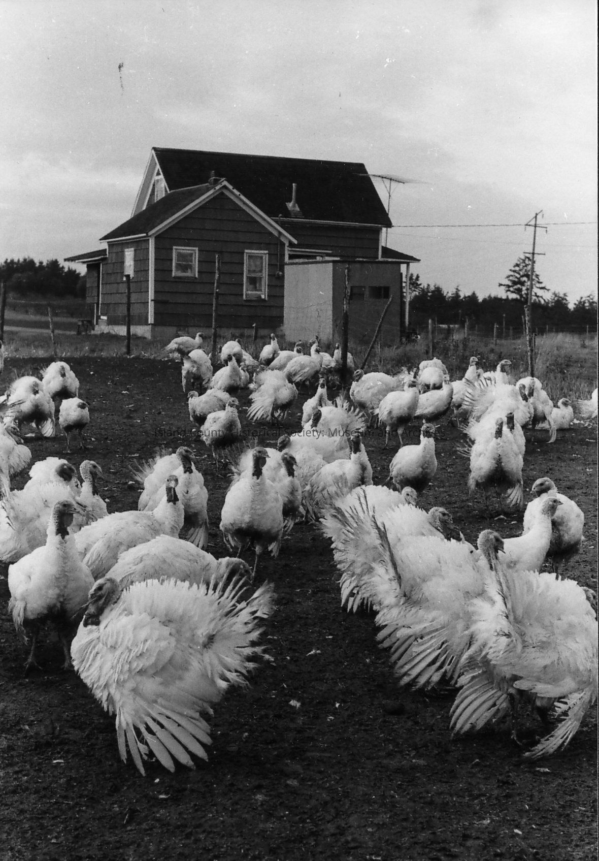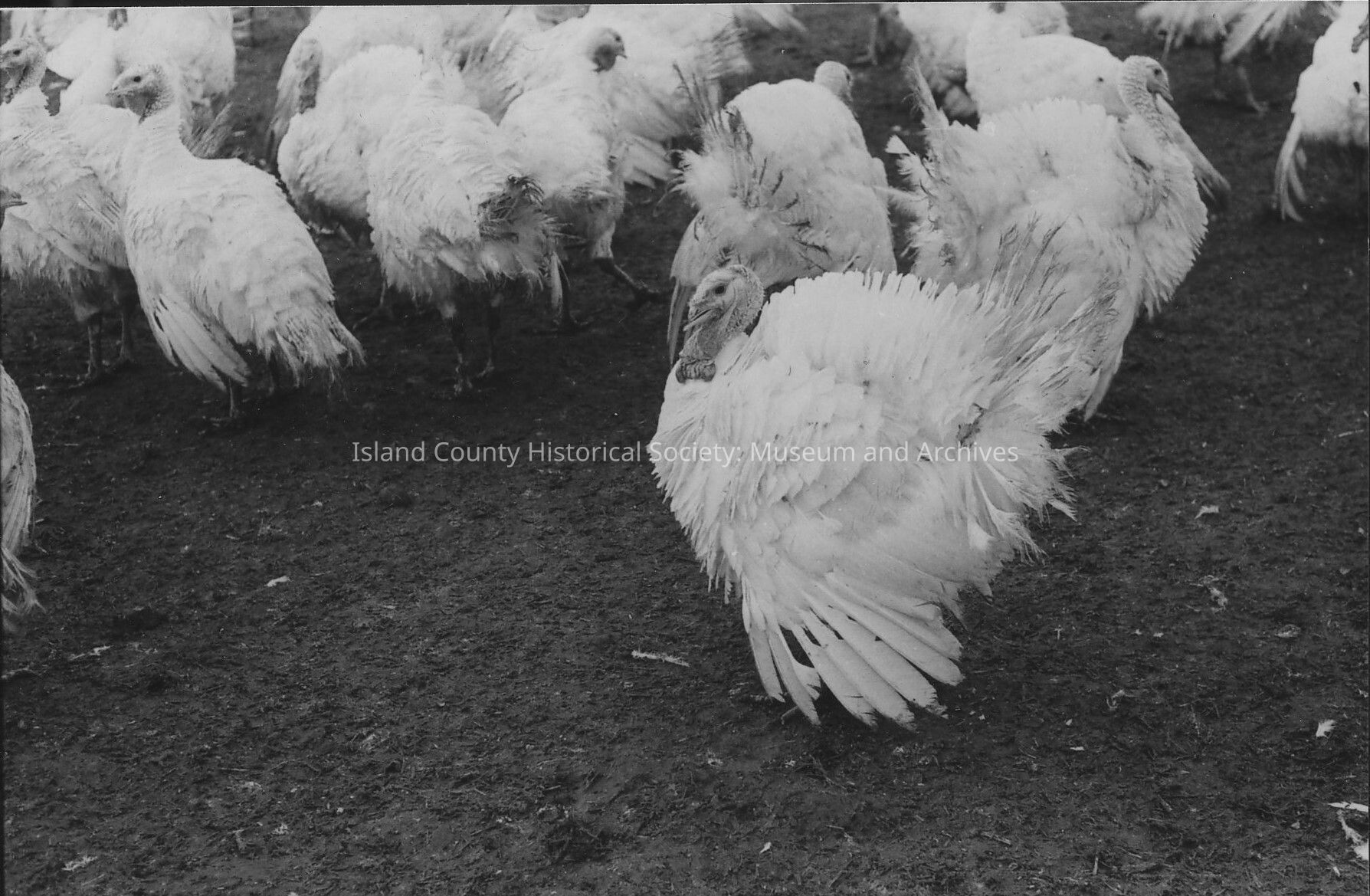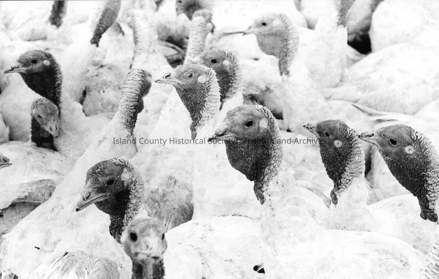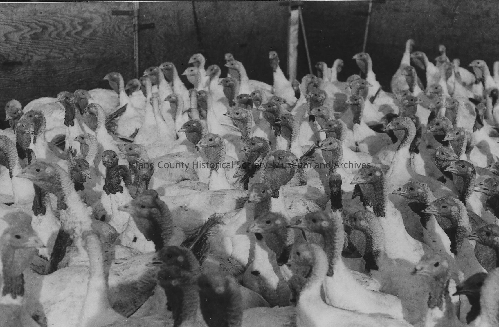 Worker loads turkeys from conveyer to cages on truck at Sherman Turkey Farm.