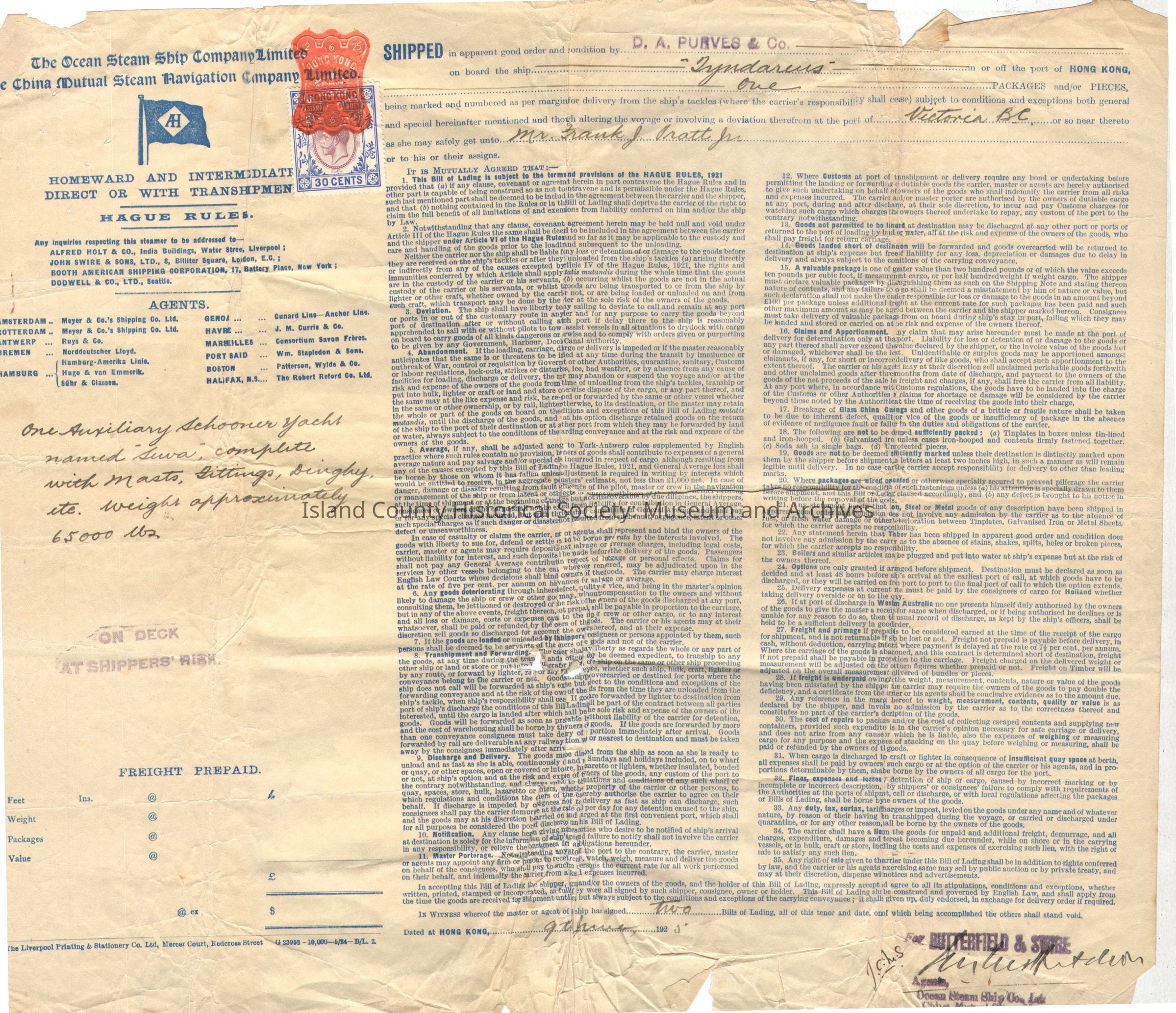 Original shipping record for the Schooner Suva. She was sent from Hong Kong to Victoria, British Columbia to get her spars installed.