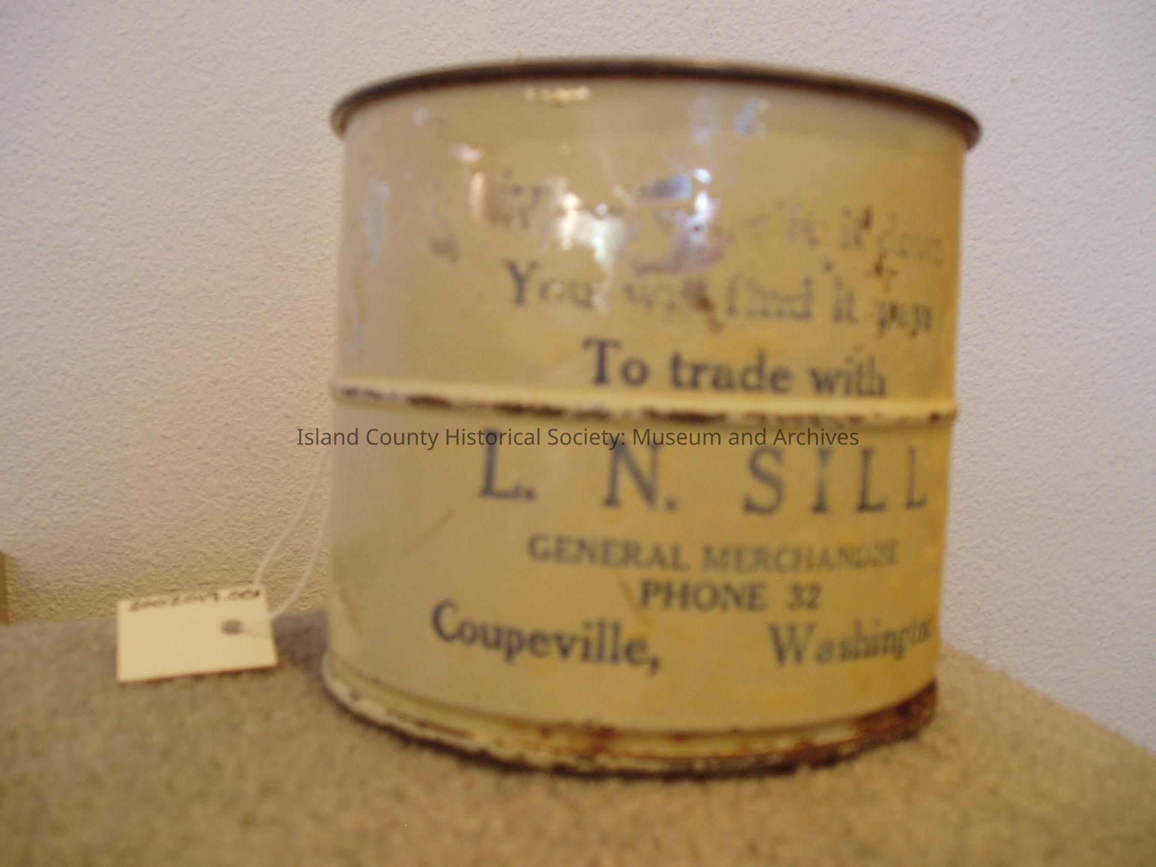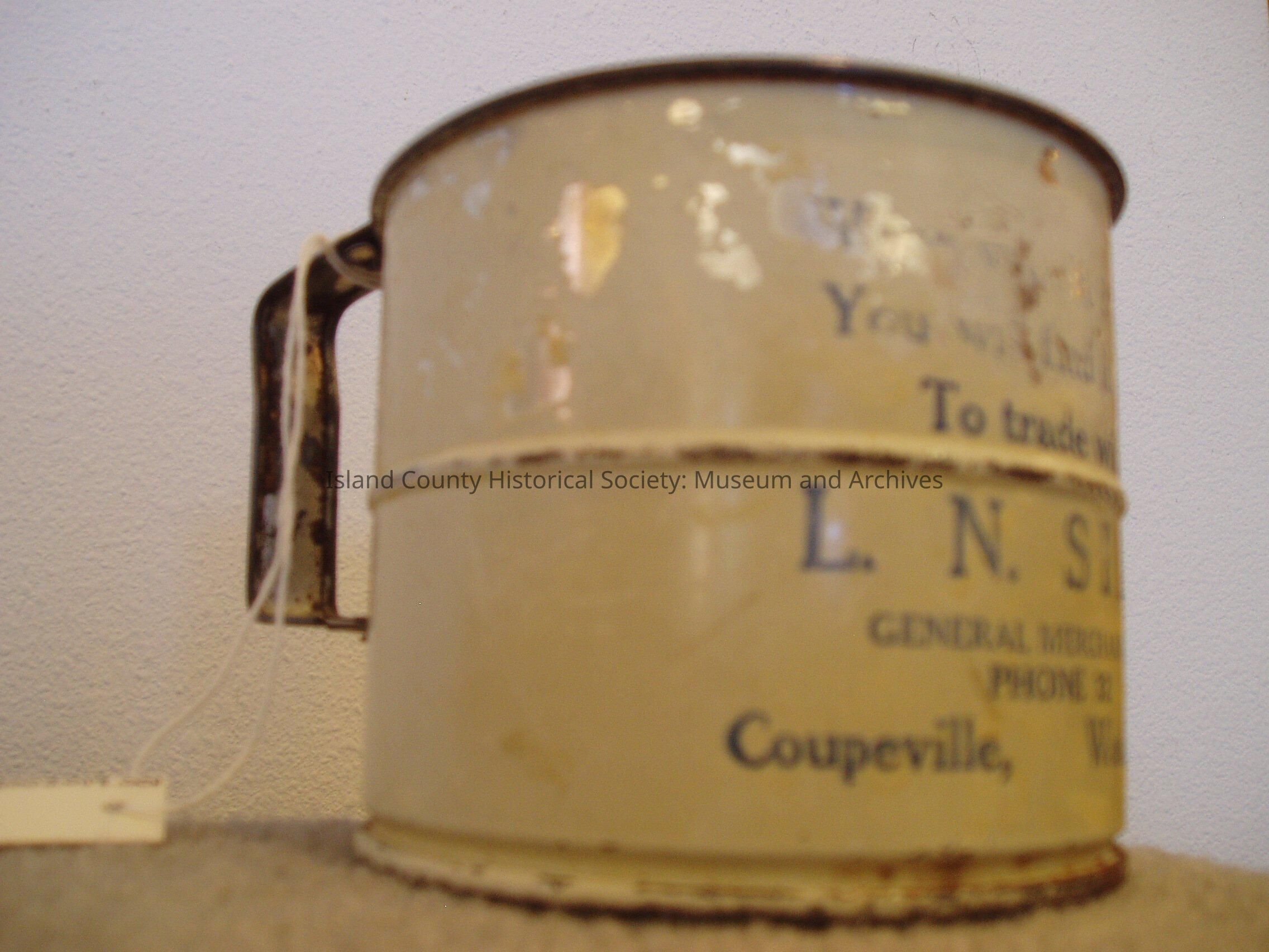 Two cup sifter. Cream colored paint coat w/ blue inked words. "FULL- TWO CUPS" and "ONE CUP" are in relief. Label on front reads: "... You will find it pays To trade with L. N. SILL GENERAL MERCHANDISE PHONE 32 Coupeville, Washington". Much of the paint has erroded, some of the internal metal too. Rust can be seen along bottom rim and seam next to handle. A screen is in the bottom.