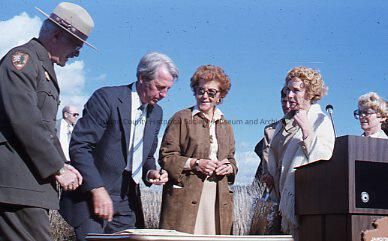 Photographic slide of document signing to establish Ebey's Landing Historical Reserve. Reed Jarvis in uniform, unknown, Roberta Smith, Marion Smith.