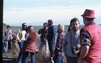 Photographic slide of signing to establish Ebey's Landing Historical Reserve. Group of younger spectators: Ken Pickard talks to man in red vest. Bobby Bailey behind Ken.