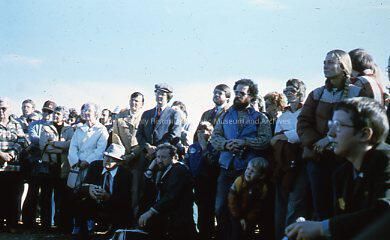 Photographic slide of signing to establish Ebey's Landing Historical Reserve. Large group of spectators standing and kneeling.