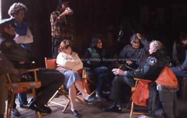 Downtown Coupeville. Filming of Cry for the Strangers, 1982. Group of actors and technicians sitting and standing.