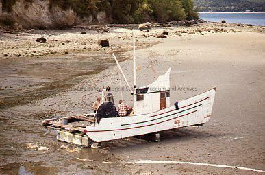 Downtown Coupeville. Filming of Cry for the Strangers, 1982. Workers buillding set of fishing boat on beach. Raft with two-dimensional boat attached.