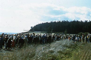Photographic slide of signing to establish Ebey's Landing Historical Reserve. Crowd of spectators in field with Pratt's Bluff in background.