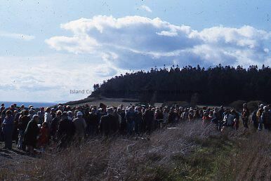 Photographic slide of signing to establish Ebey's Landing Historical Reserve. Crowd of spectators in field with Pratt's Bluff in background.