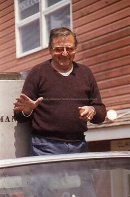 Downtown Coupeville. Filming of Cry for the Strangers, 1982. Director standing in convertible and gesturing.