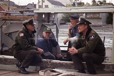 Filming of 1982 film "Cry For The Strangers" in Coupeville, WA. Actors dressed as police officers and fishermen talk and smoke near a set of fishing boat.