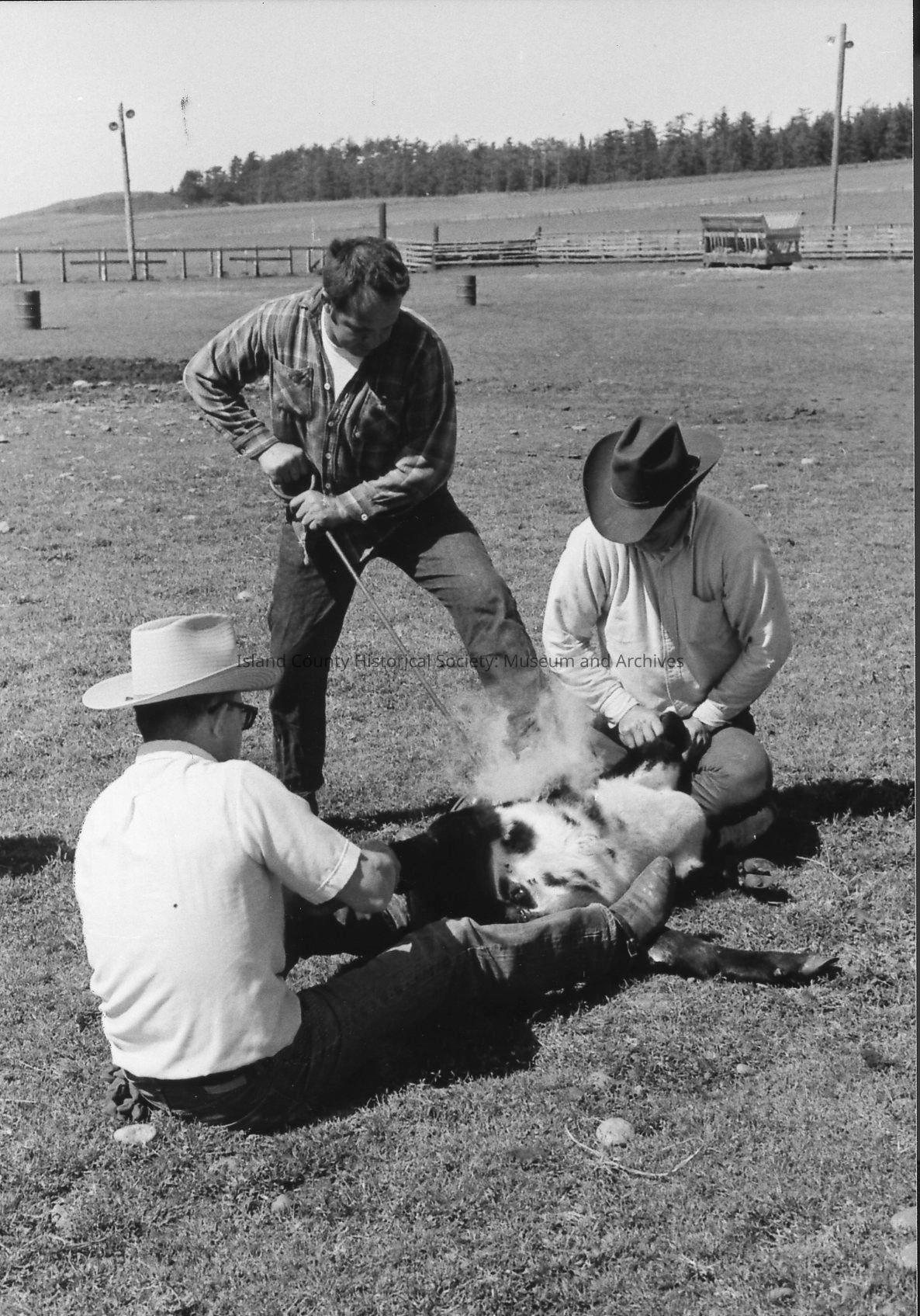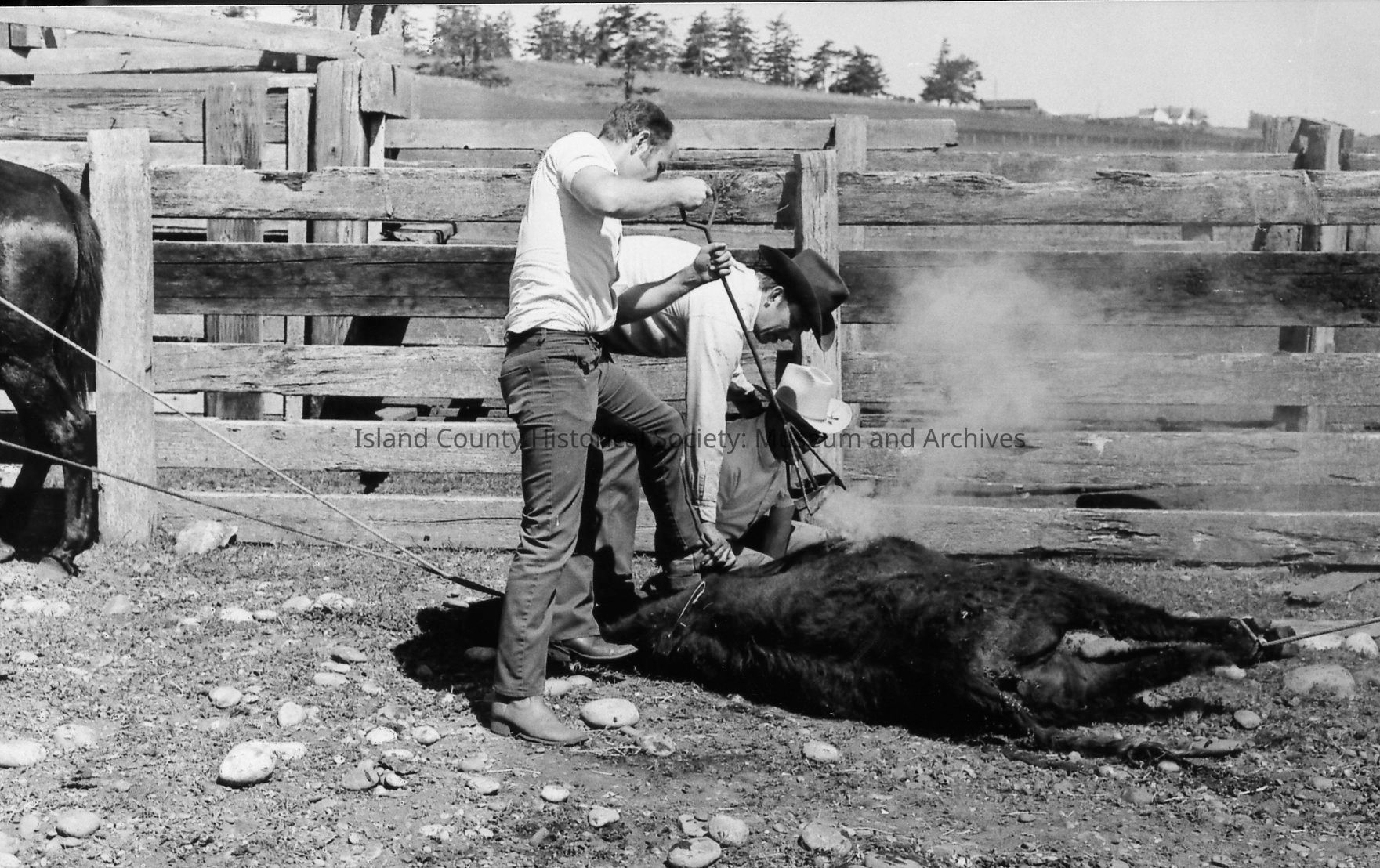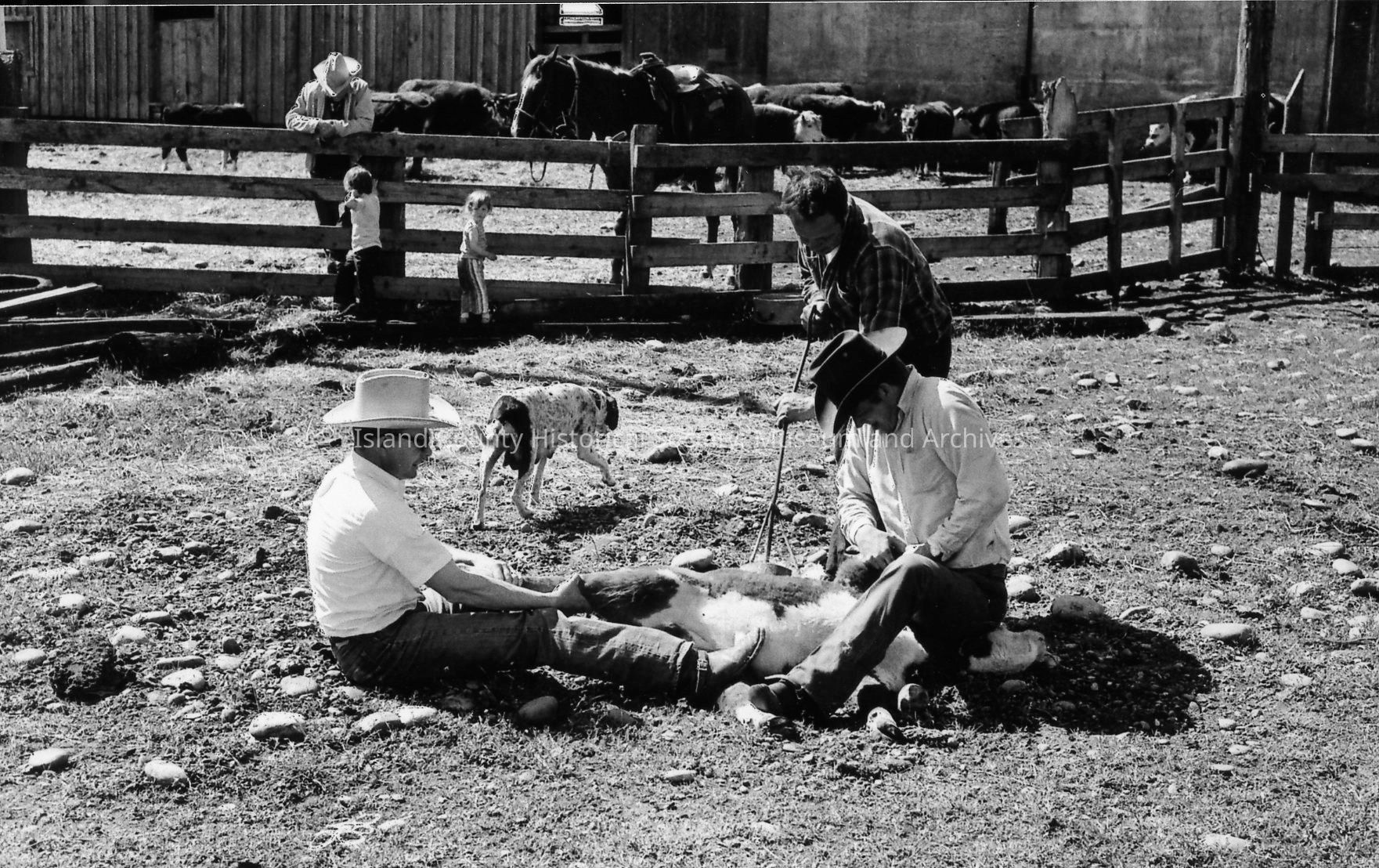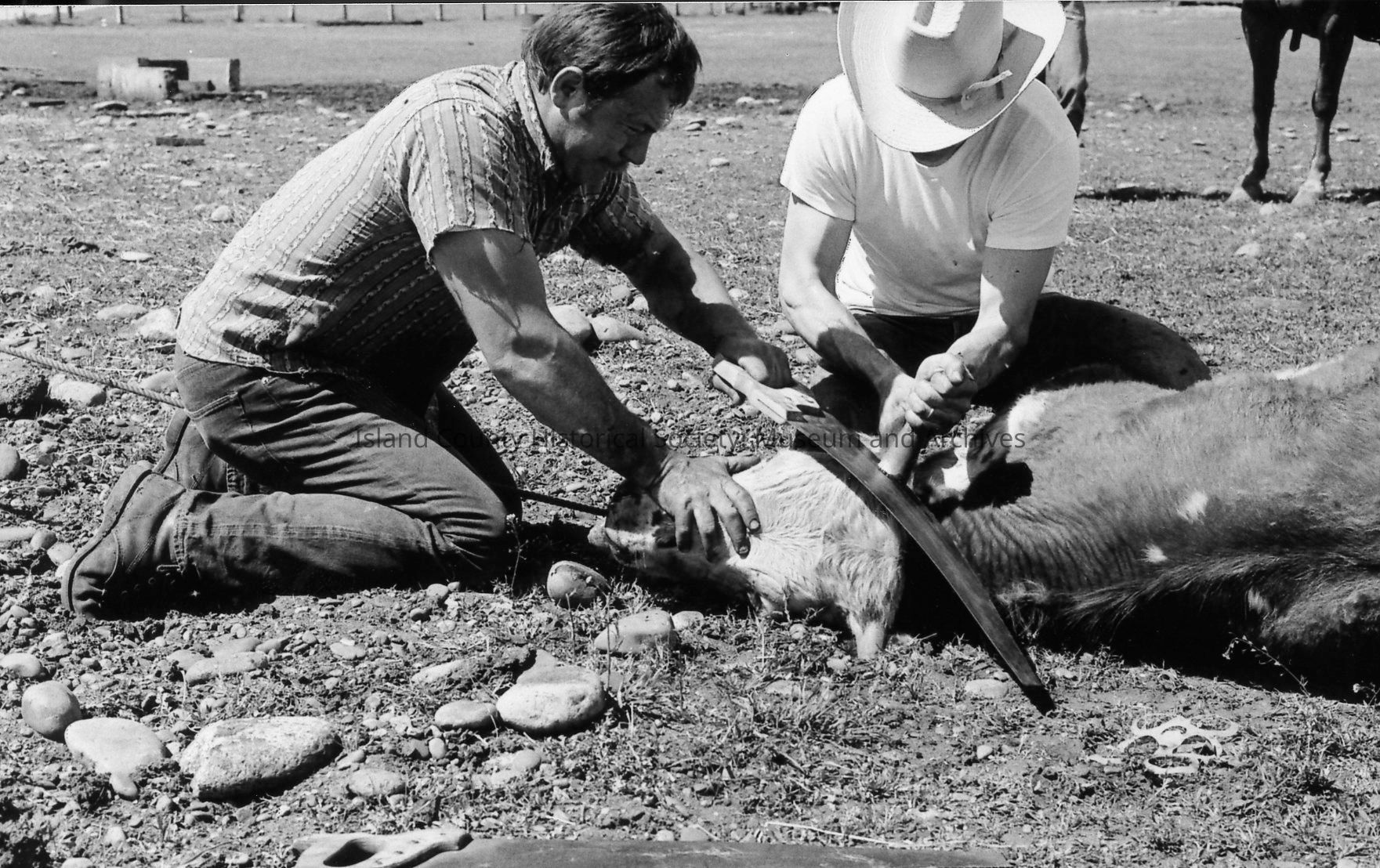 Closeup of brand on calf at 1972 roundup. Photos of branding and removal of horn.Photograph Details