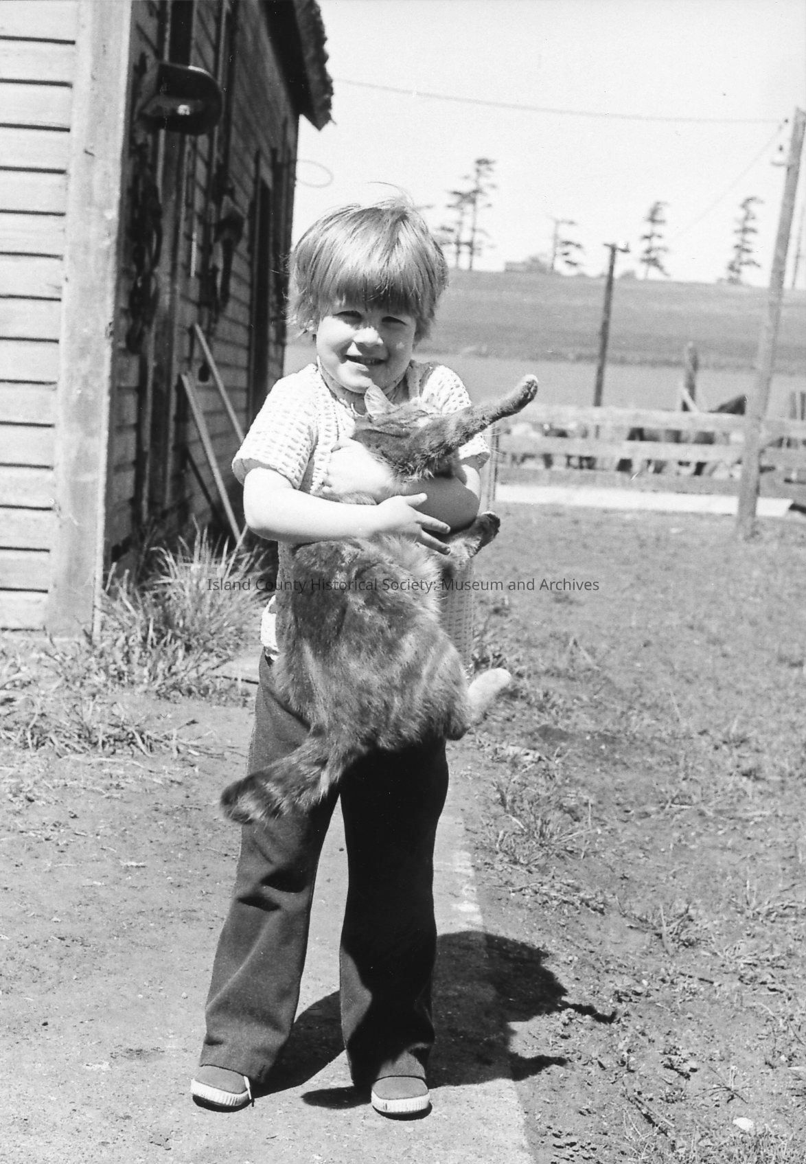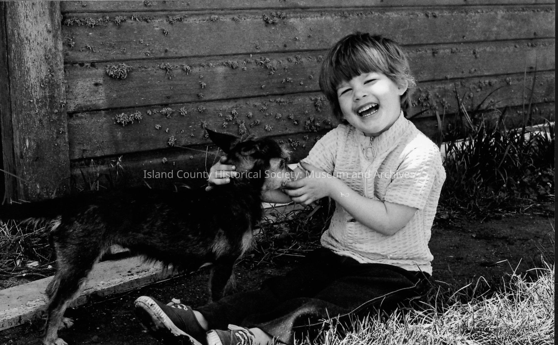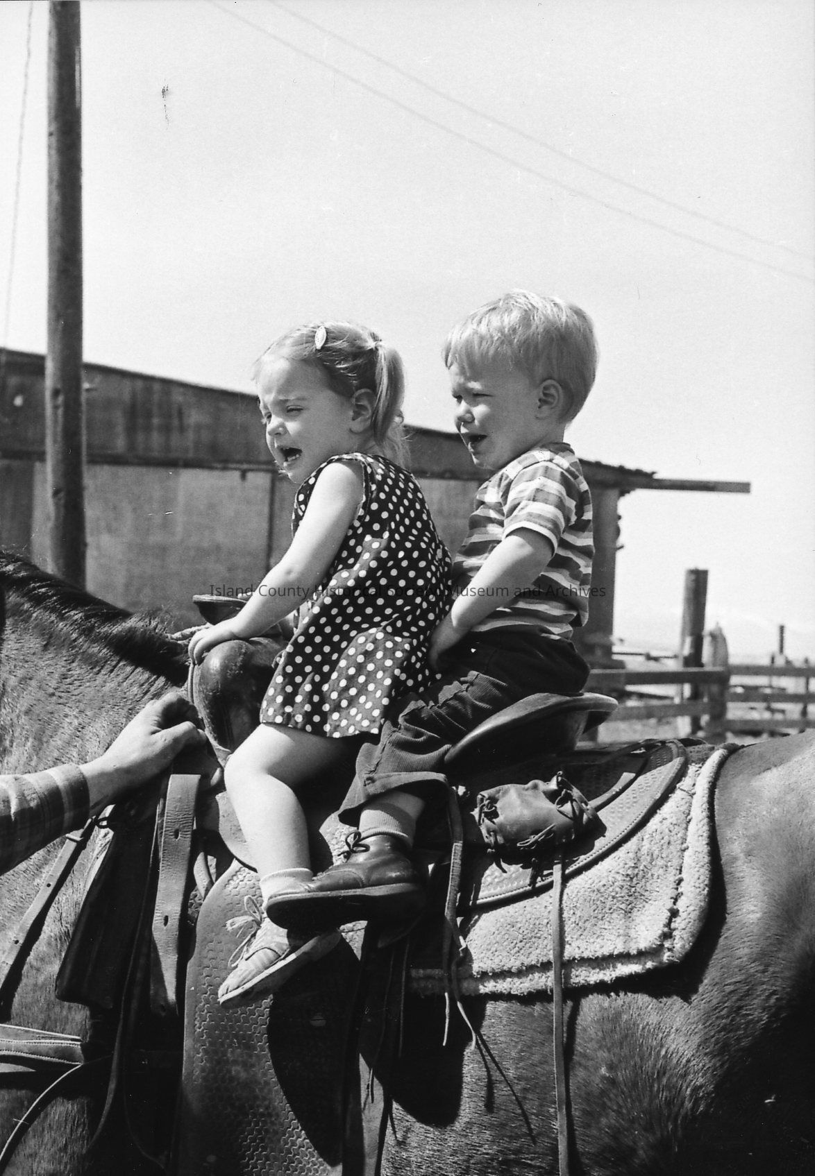 Two small crying children share a saddle on a large horse at the 1972 roundup. Another plays with his cat and dog.Photograph Details
