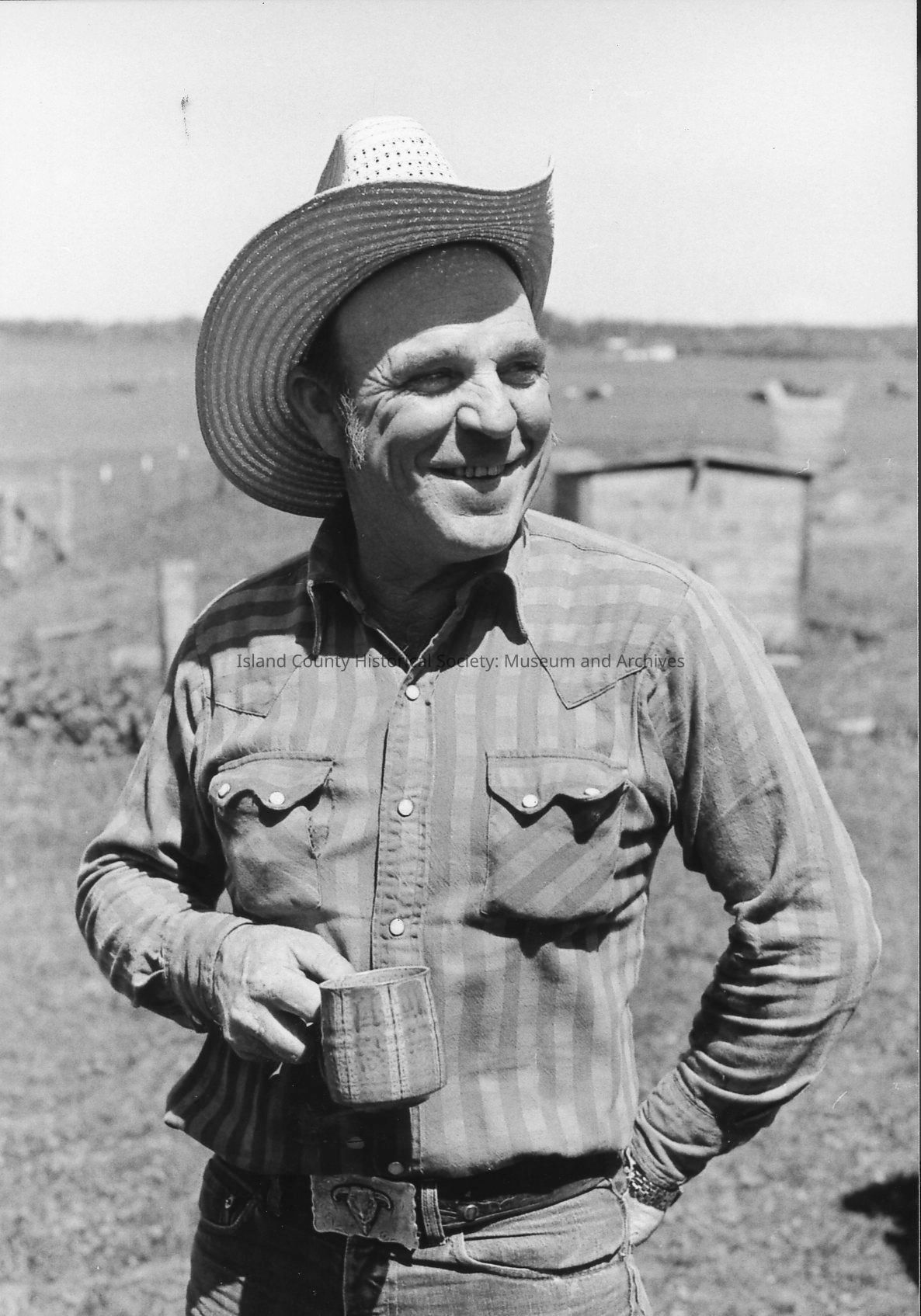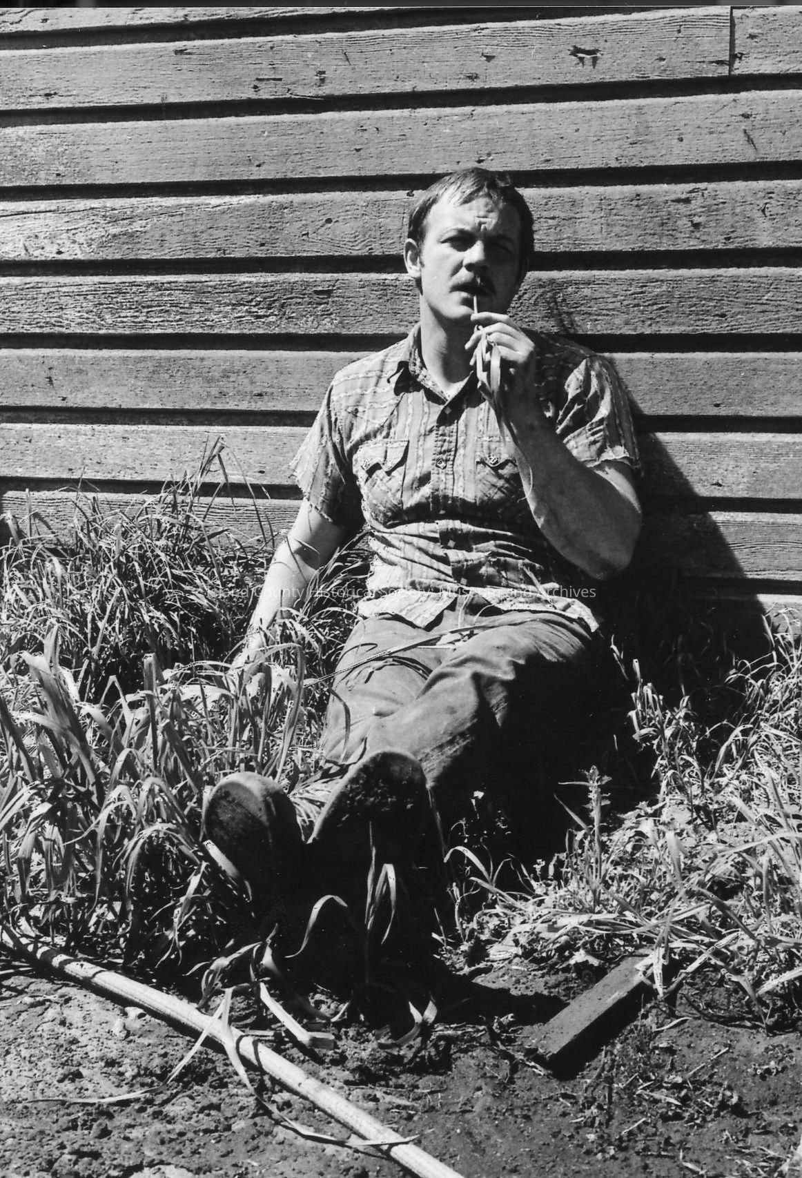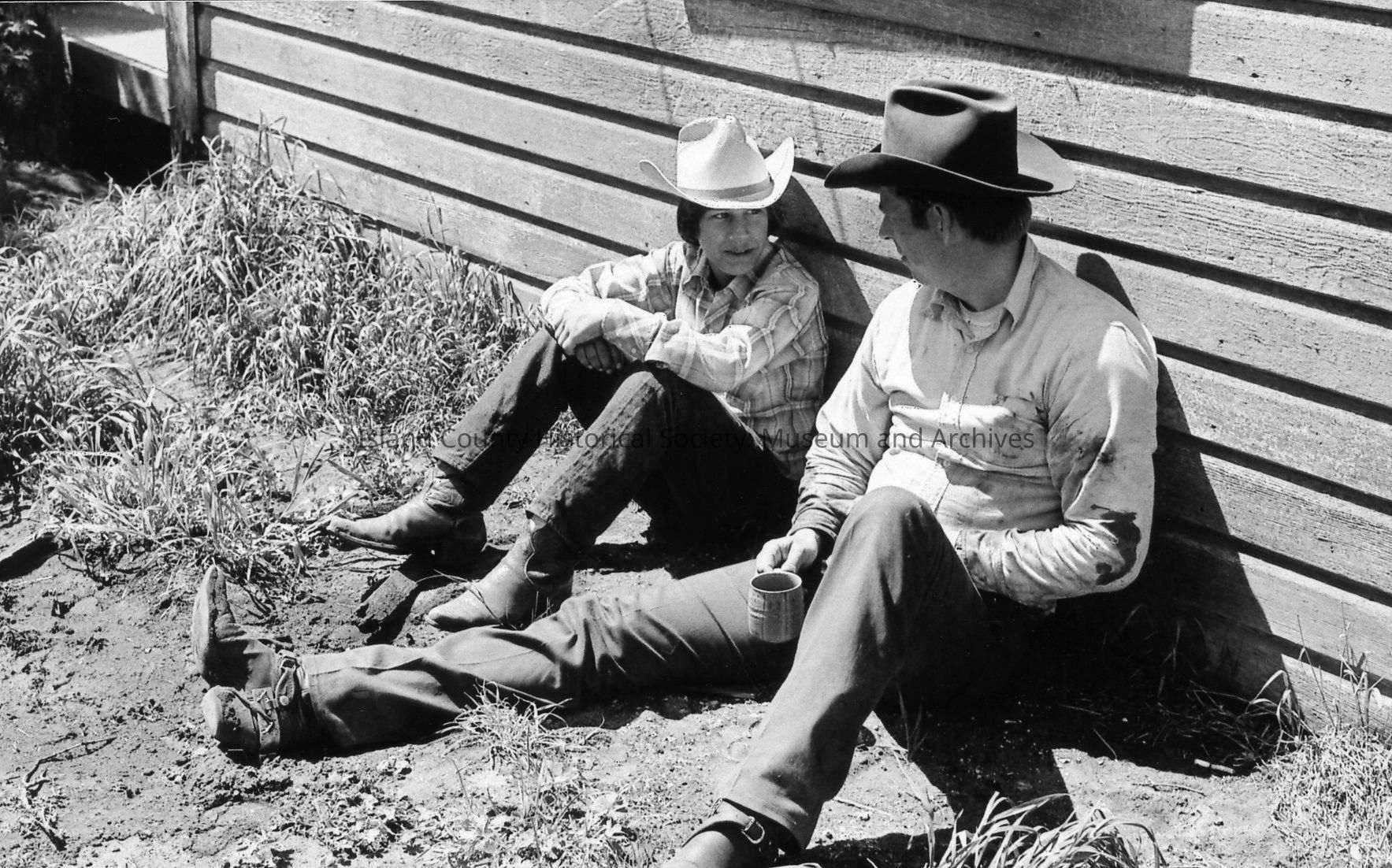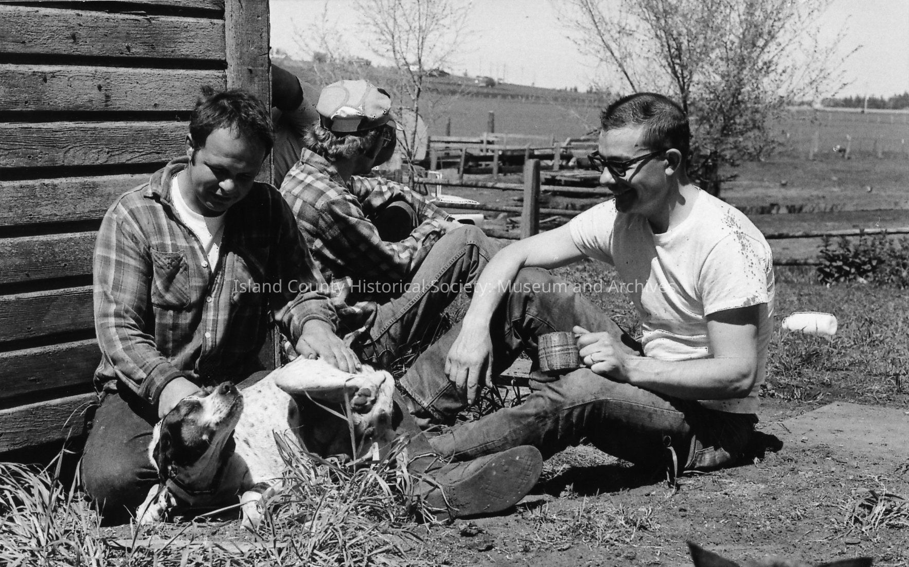 Men at rest at 1972 roundup. Bill Smith scratches a dog who is pleased with the attention. Another man holding a mug watches and smiles. Others are in the background and in single shots.Photograph Details