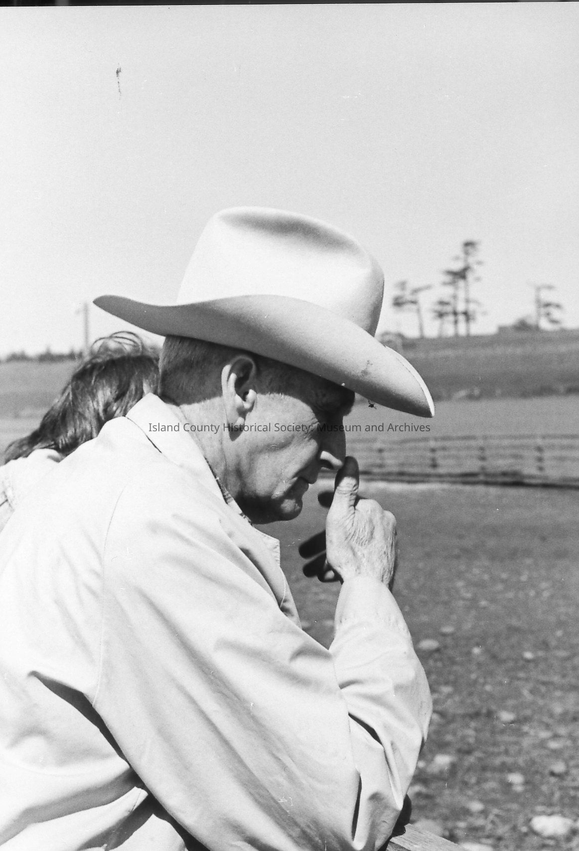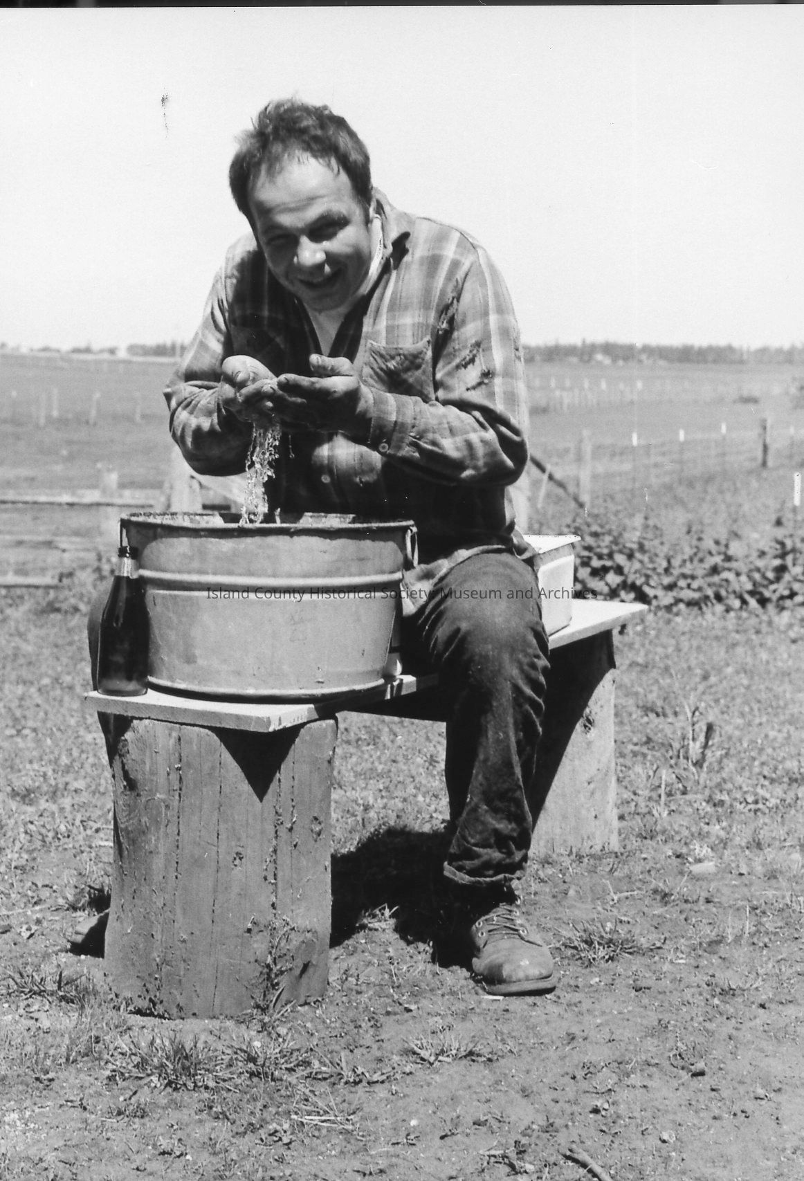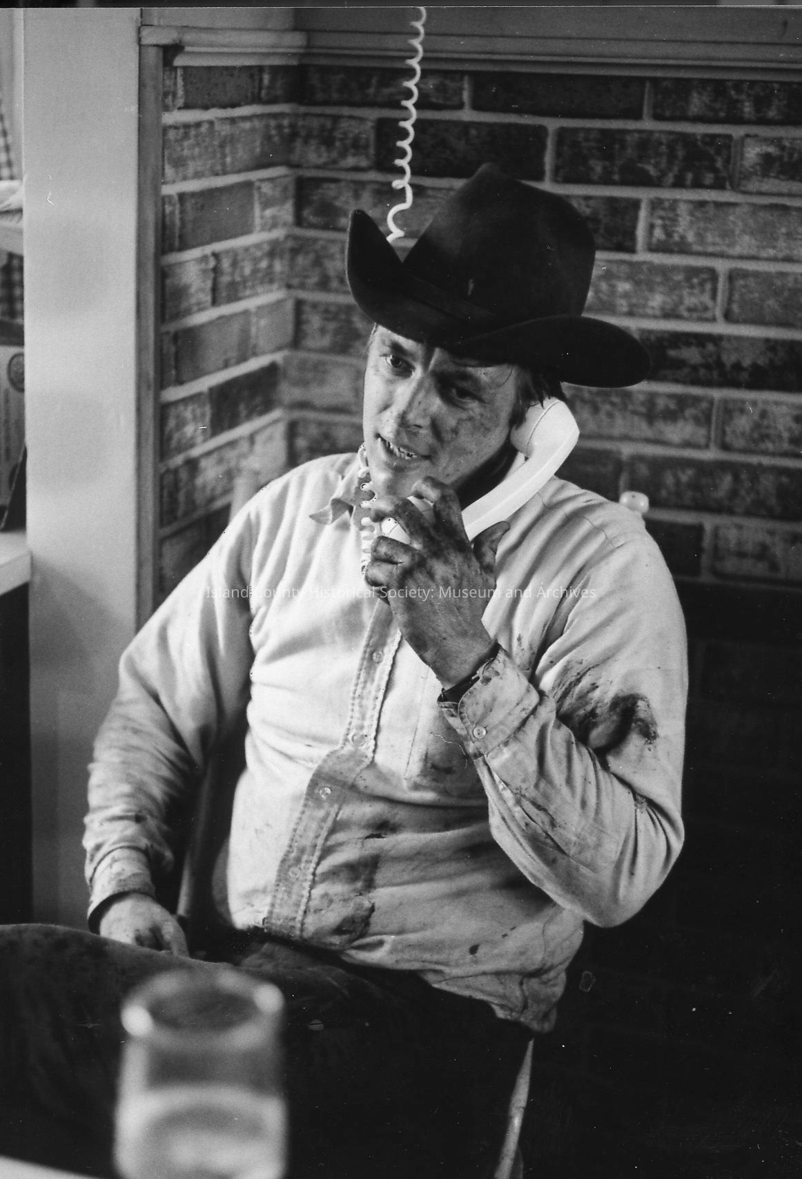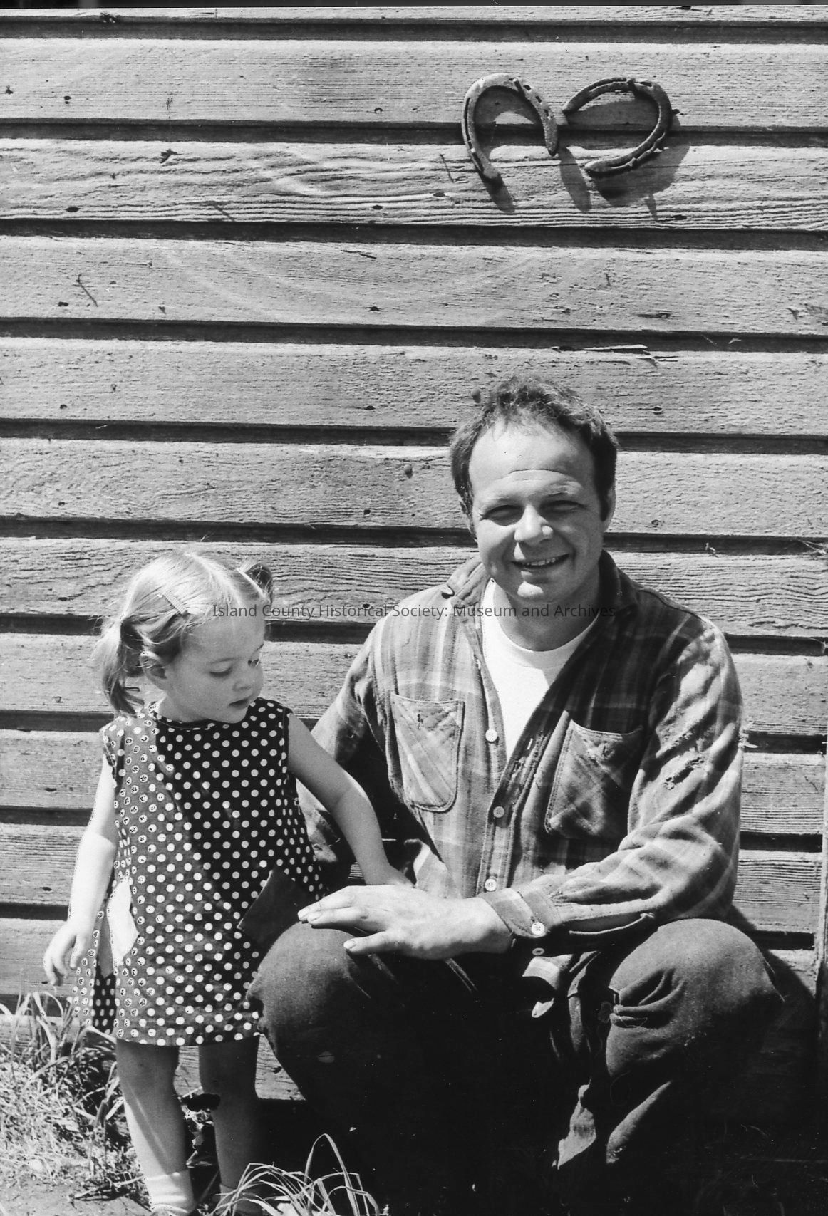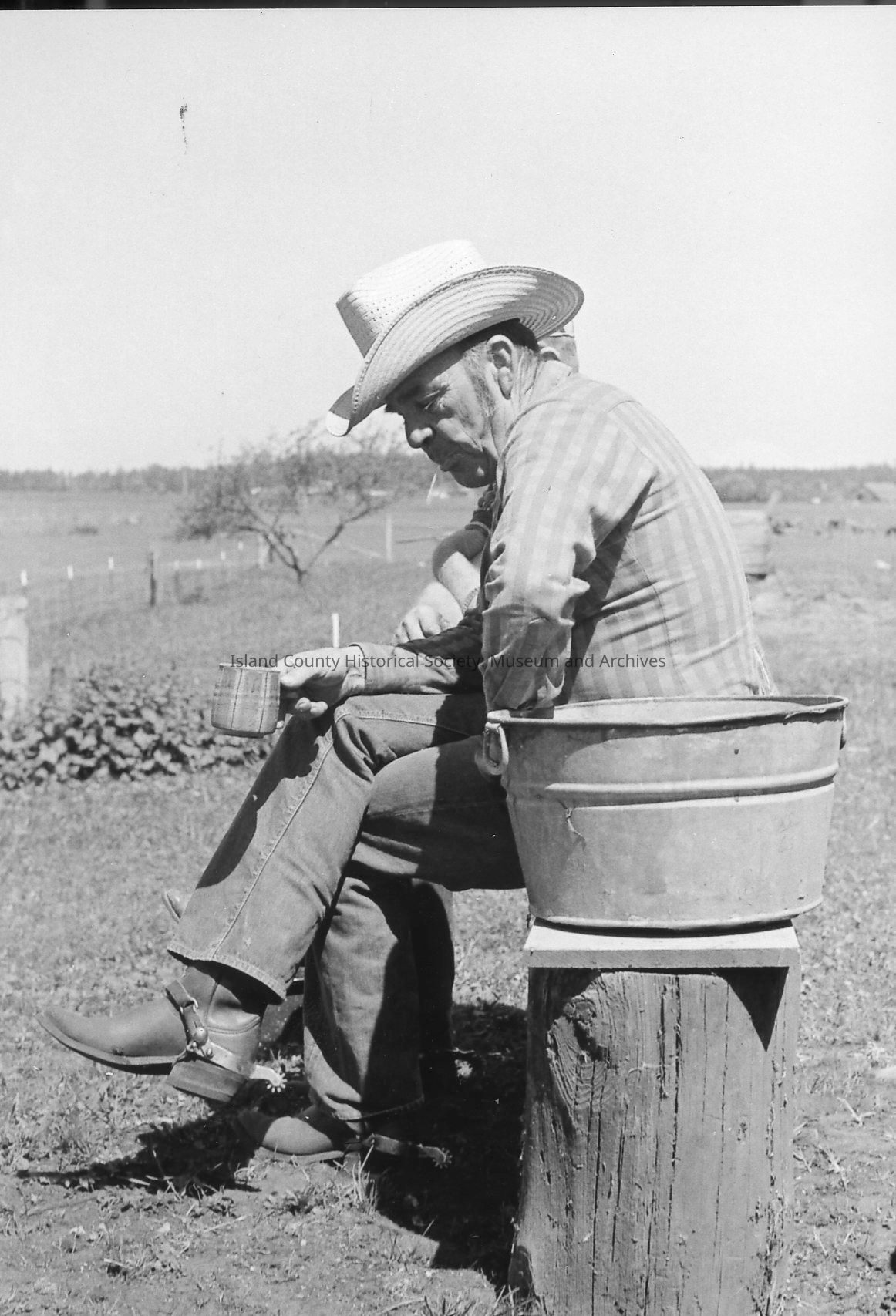 Men at rest at 1972 roundup. Bill Smith scratches a dog who is pleased with the attention. Another man holding a mug watches and smiles. Others are in the background and in single shots.Photograph Details
