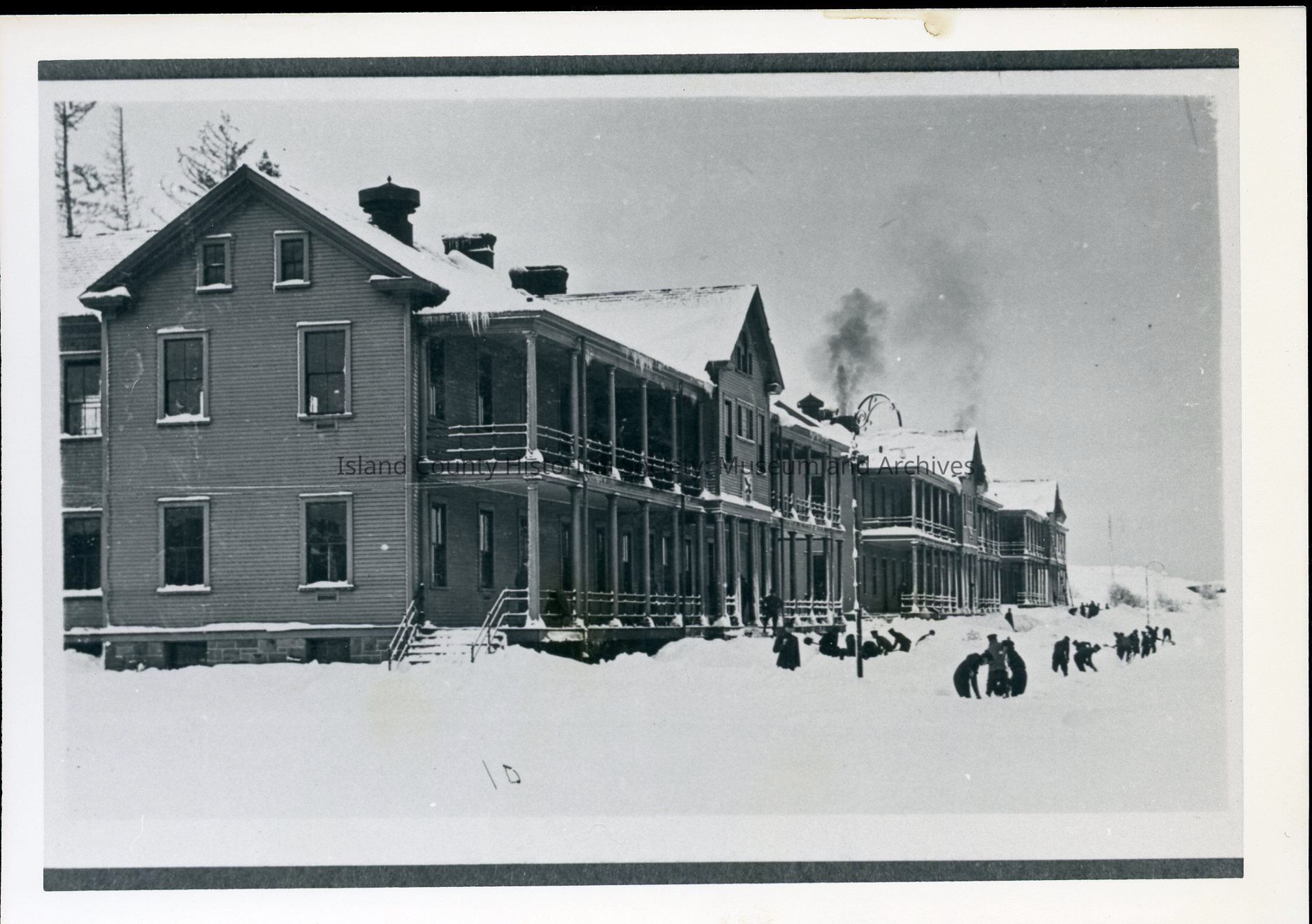 Photograph of heavy snowfall at barracks, likely Fort Worden (but possibly Fort Casey). Soldiers shovel snow in front of the buildings. Likely c. 1910s.
