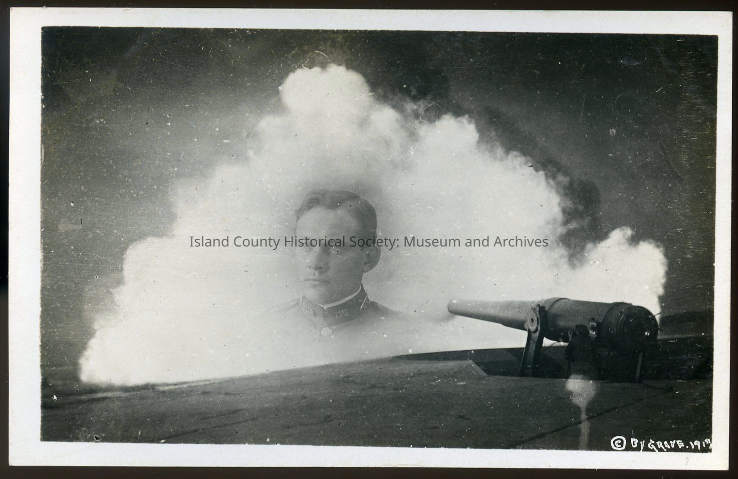 Postcard captioned "A Gunner's Vision", dated 1913. Depicts an image of a soldier in the smoke of a 10" disappearing rifle's fire at Fort Casey. Copyrighted by "Grove".Collection