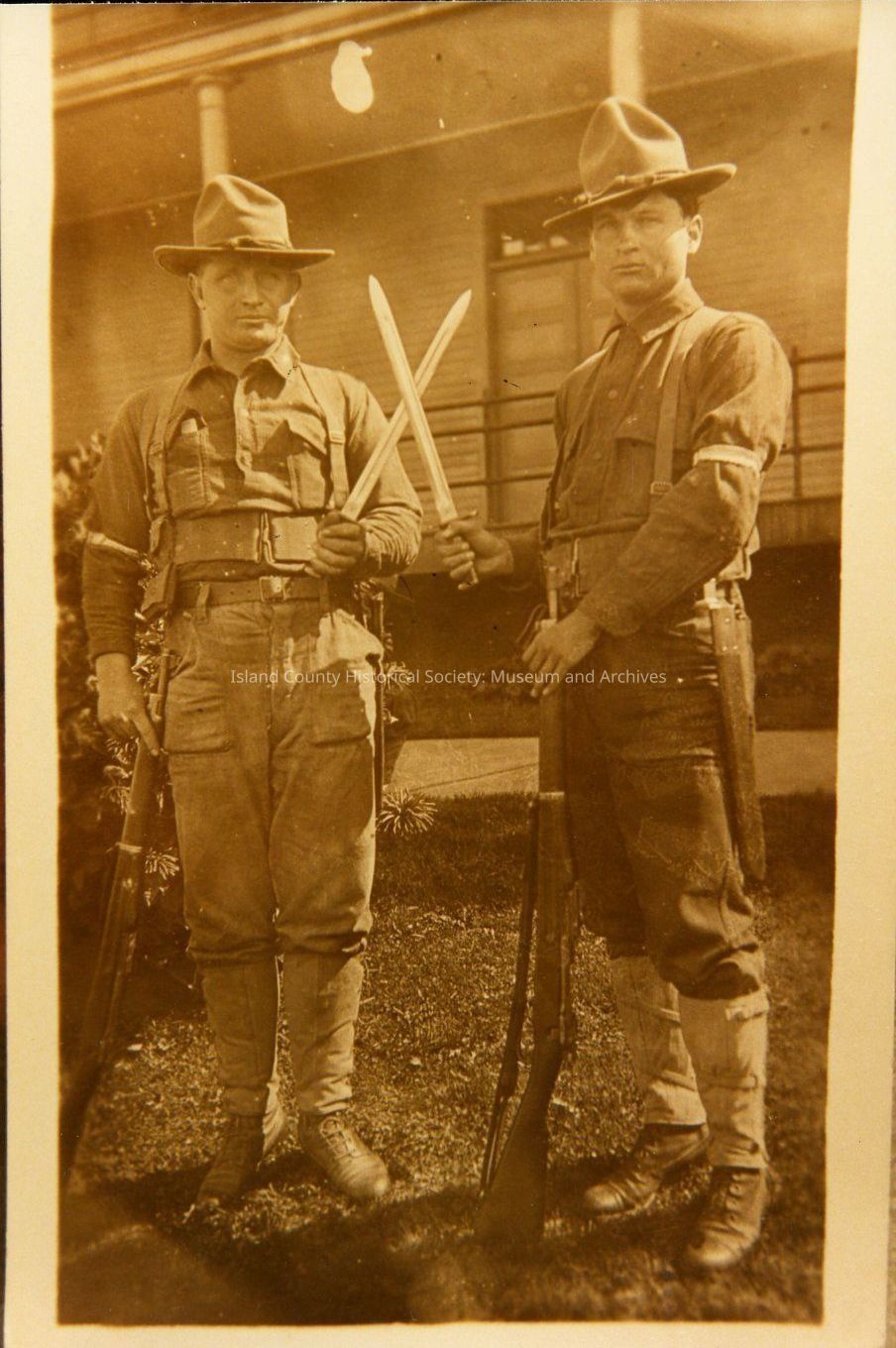 Photograph depicting two soldiers dressed in full field uniform, c. 1904-1914. They are holding Lee-Enfield rifles and bayonets, and are standing in front of the main barracks of Fort Casey.Photograph Details