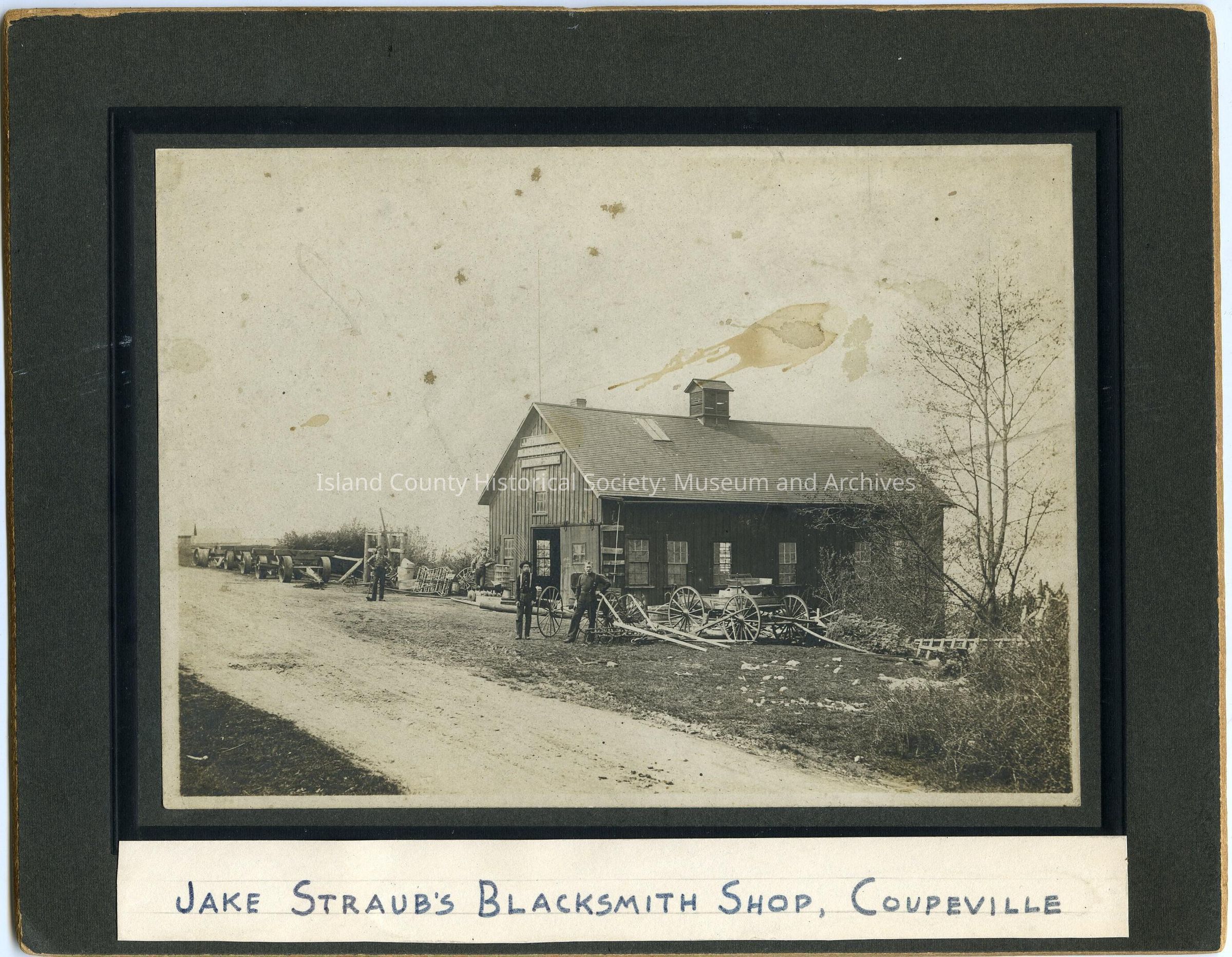 Photo on cardboard of Jake Straub's Blacksmith shop, exterior. On the top of the shop: J. J. Straub & Son, Blacksmith-horse shoeing, Wagon-shop. The building is on Penn Cove. Wagon, wagon wheels, perhaps tractor wheels (large) are scattered around the garage. Four men are standing looking at the photographer. Dirt road. Caption: Jake Straub's Blacksmith Shop, Coupeville. On the back: given by Howard Davies.
