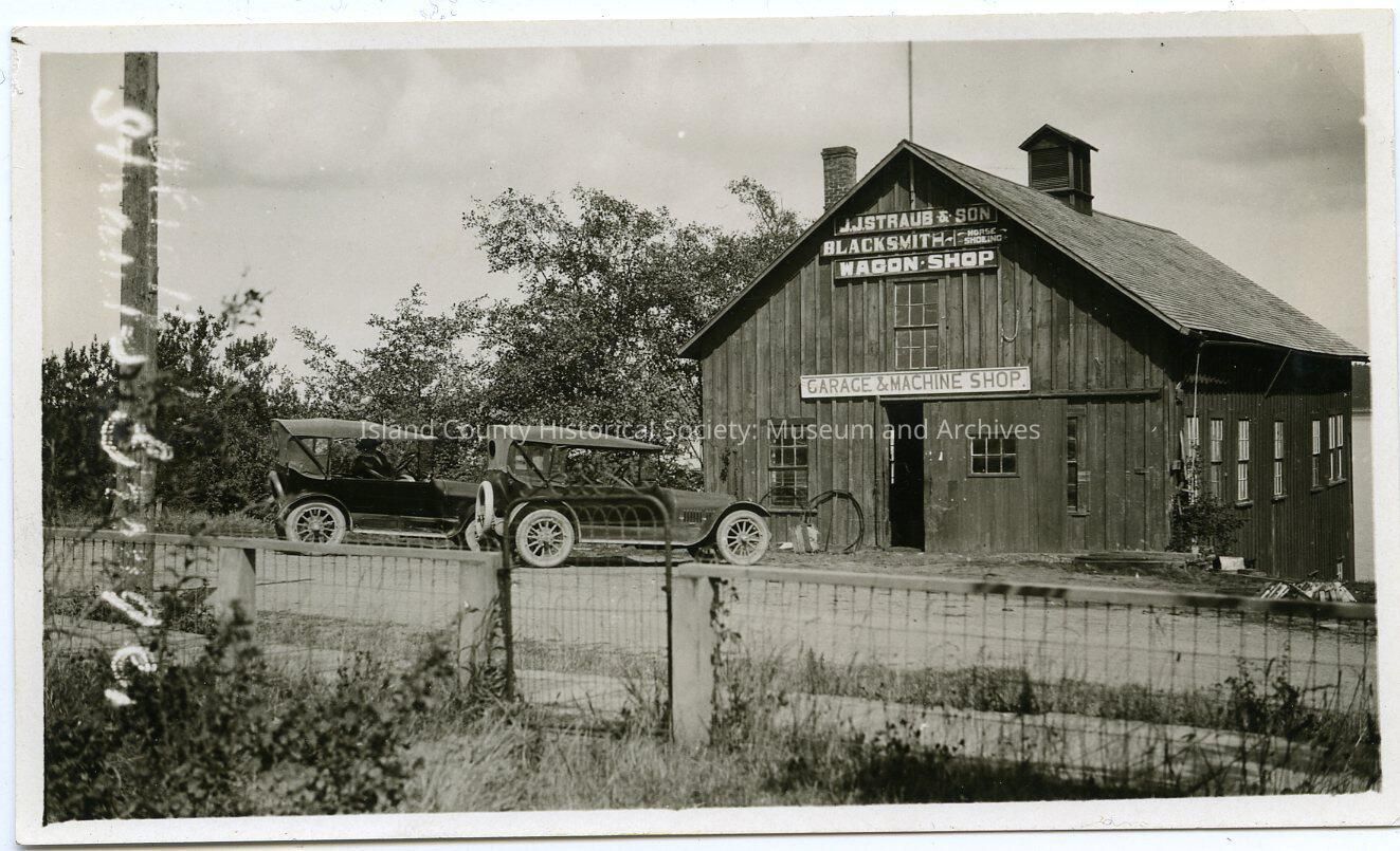Photo of Straub's Blacksmith shop, exterior, with two cars; in one on the left, someone is in the front seat. On the side is written: Straub's Garage. On the top of the shop: J. J. Straub & Son, Blacksmith-horse shoeing, Wagon-shop. Above the doors: Garage Machine Shop. The building is on Penn Cove. Two wheels are leaning against the building. Metal short fence is in the foreground with a gate to the wood sidewalk.