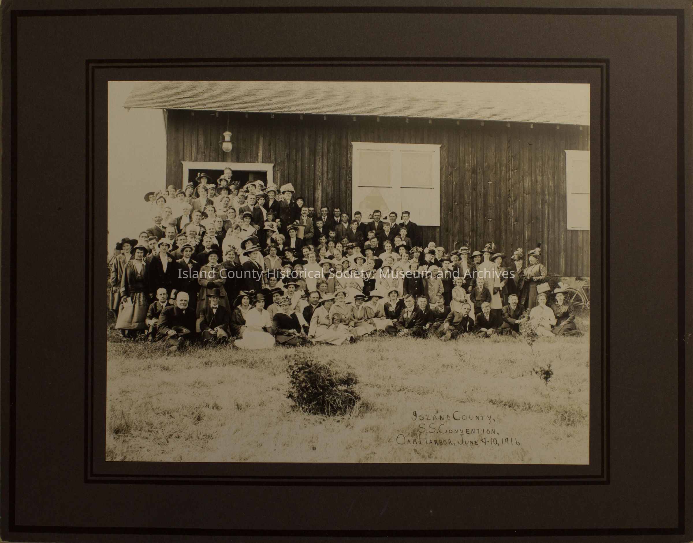 A photo of many women and men in front of a building. Written on the front is "Island County, S.S. Convention, Oak Harbor, June 9-10, 1916. Handwritten on the back is "Island County Sunday School Convention."Made/Created