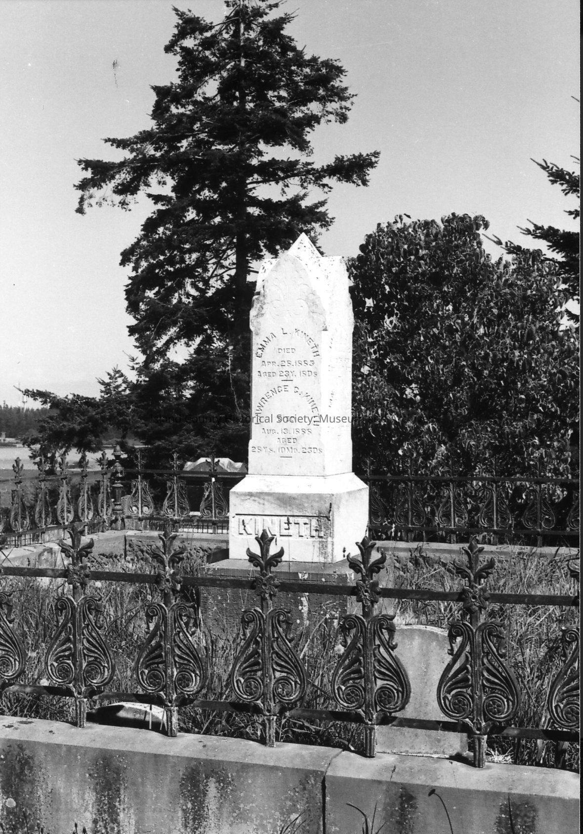 A tall white monument stands inside a fenced plot at Sunnyside Cemetery. Emma L Kineth Died Apr 28 1883 Aged 23Y 18Ds. Lawrence G Kineth Died Aug 13 1888 Aged 28Y 10 Mo 23 DPhotograph Details