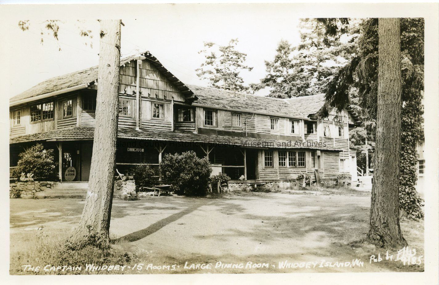 Postcard depicting the Captain Whidbey Inn (also known as the Whidbey Isle Inn), Whidbey Island, likely c. 1950s. Text on the front of the postcard describes its 16 rooms and large dining room. Photo by Ellis.Collection