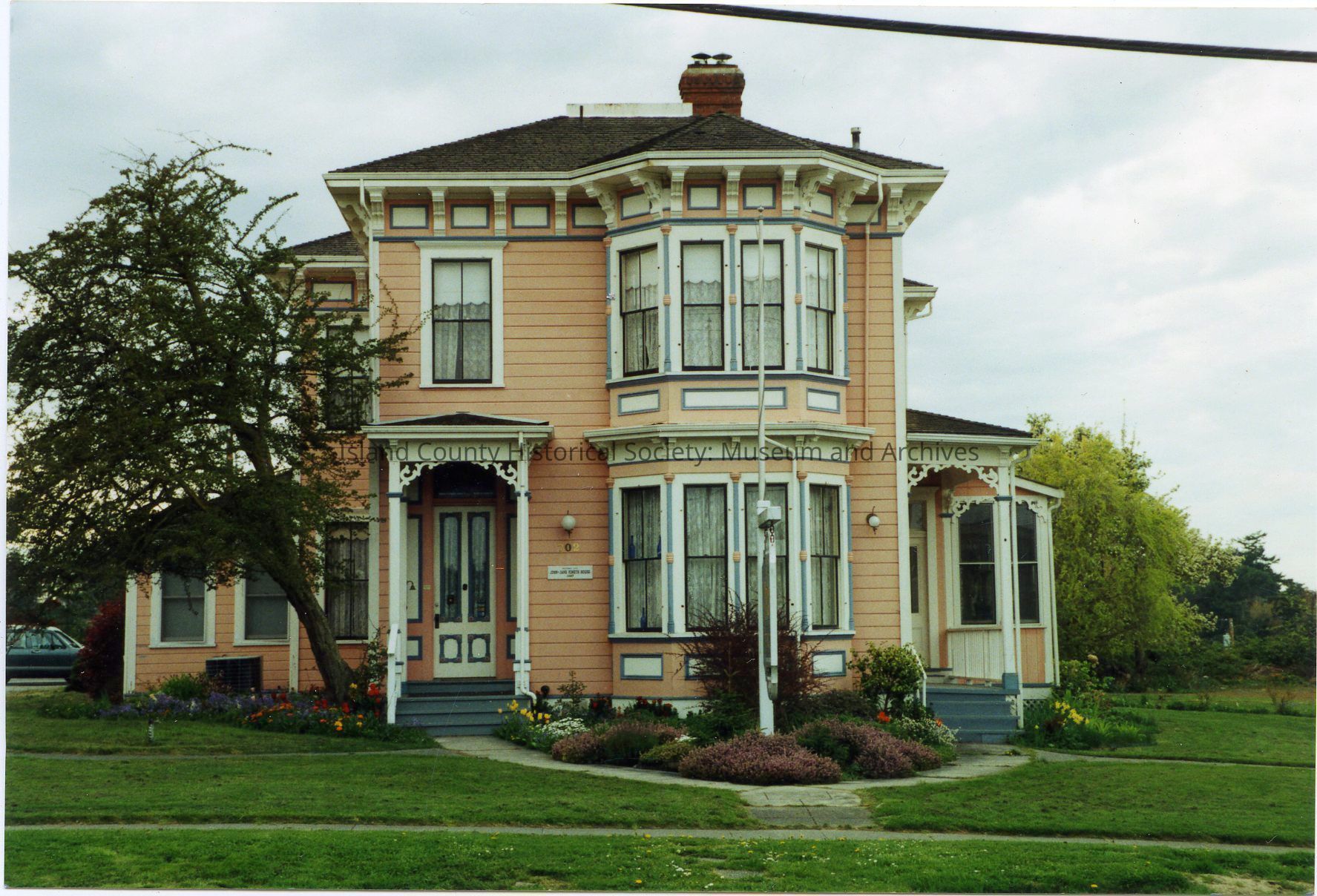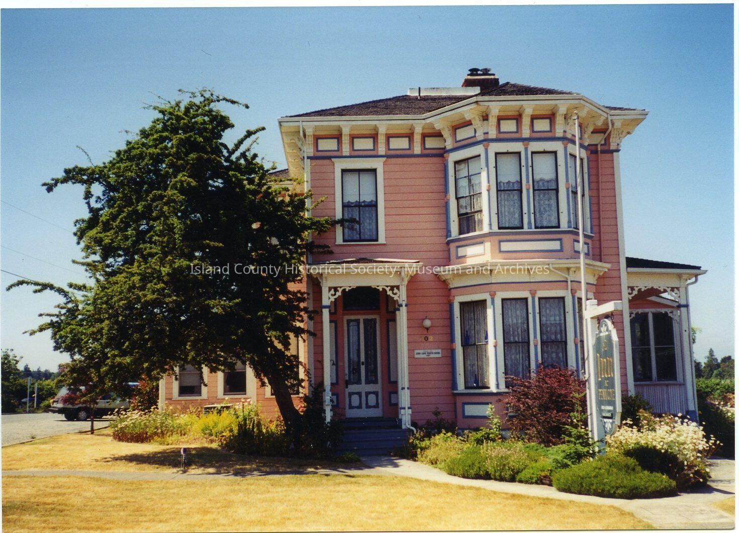 Three photos of two-story house with a central chimney, door and portico on the left, door and porch on the right side. Large two-story bay windows. Paths to each side from central sidewalk. Bushes and trees. White rectangular sign on the left side. Painted pink with white trim. Parking on the left in back. Sign in front: The Inn at Penn Cove Bed and Breakfast. Sticker: The Kineth House (1887) John and Jane Kineth (Blue Goose Inn) 702 N. Main St. Aug., 2008