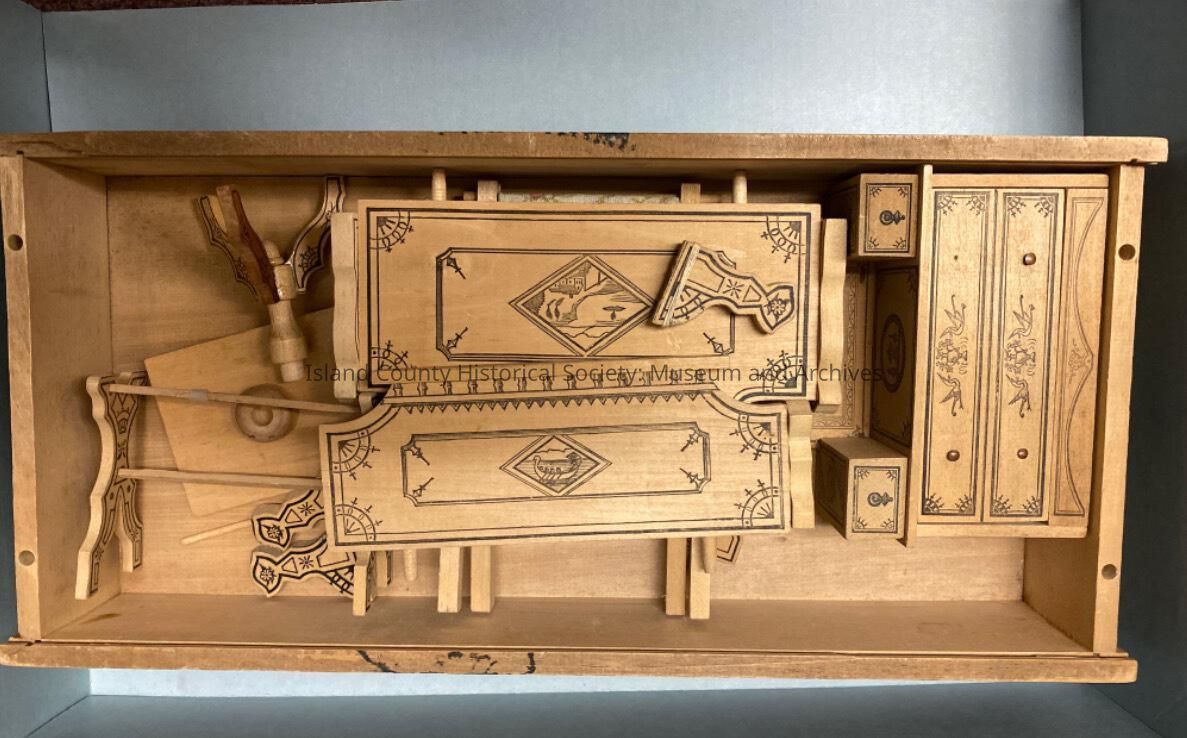 A wooden box with designs printed onto it, containing pieces to a game or toy that are also made of wood. The pieces seem to create a miniature bedroom set.