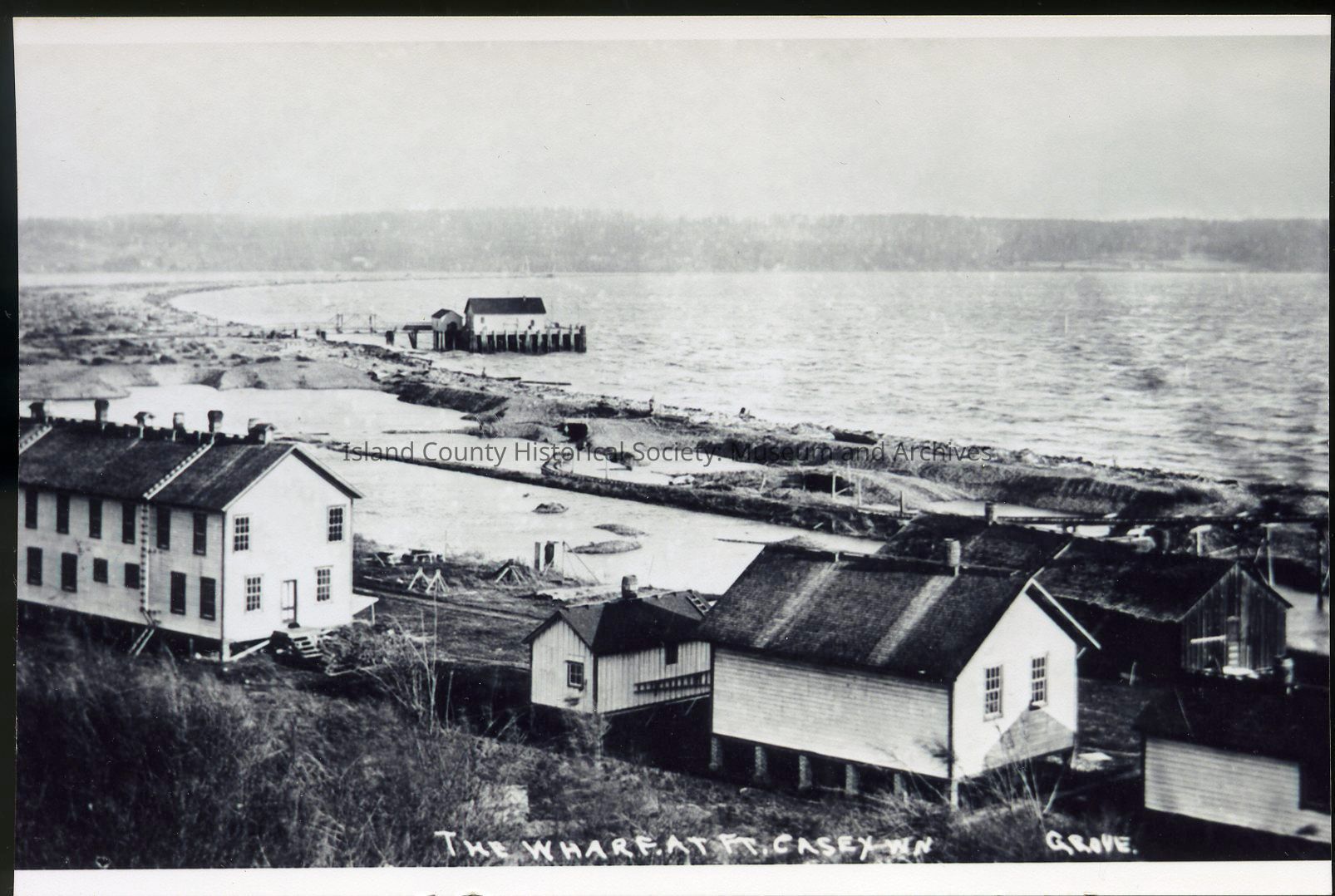 Photograph of Fort Casey's Quartermaster's wharf and buildings. The pits at the edge of the water in the background of the photo are dredged ponds, which were used to collect gravel for the bunkers at the fort. C. pre-World War I. Photo by "Grove".Photograph Details