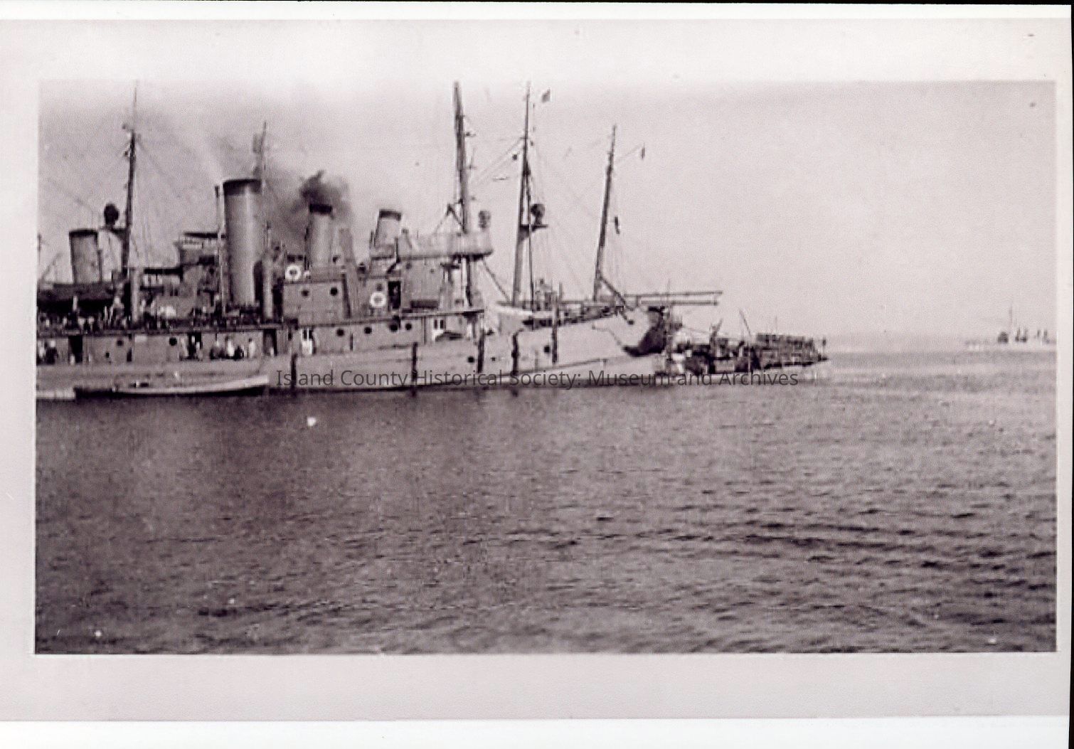 Photograph of the "Zeilen" at Fort Casey's Quartermaster's Dock, 28th July 1923. The Zeilen collided on this day with transport ship "Henderson" in the fog of Admiralty Inlet. The Henderson was carring President Warren G. Harding to Seattle. The Zeilen was towed to Fort Casey and then later to Bremerton.Photograph Details