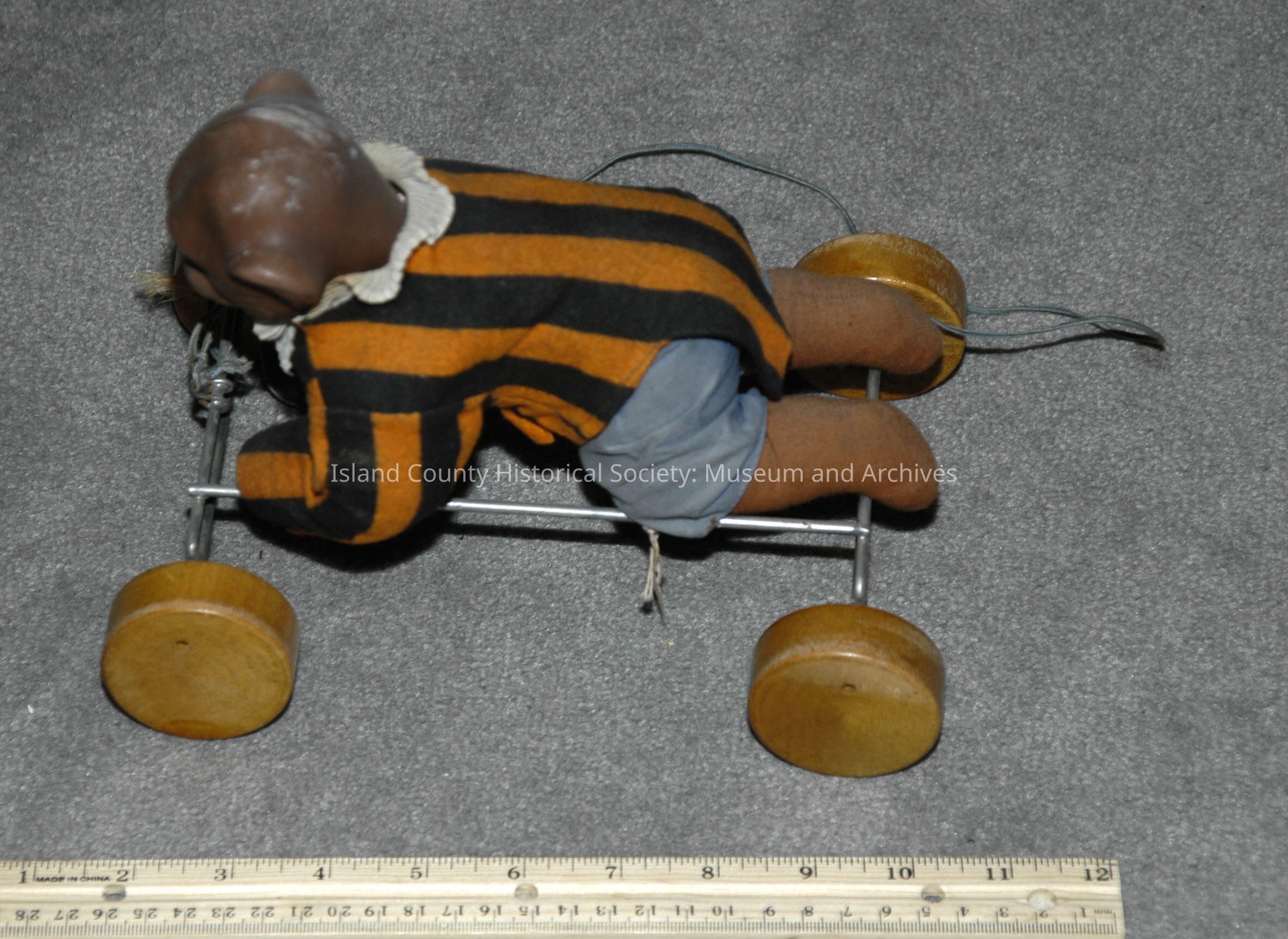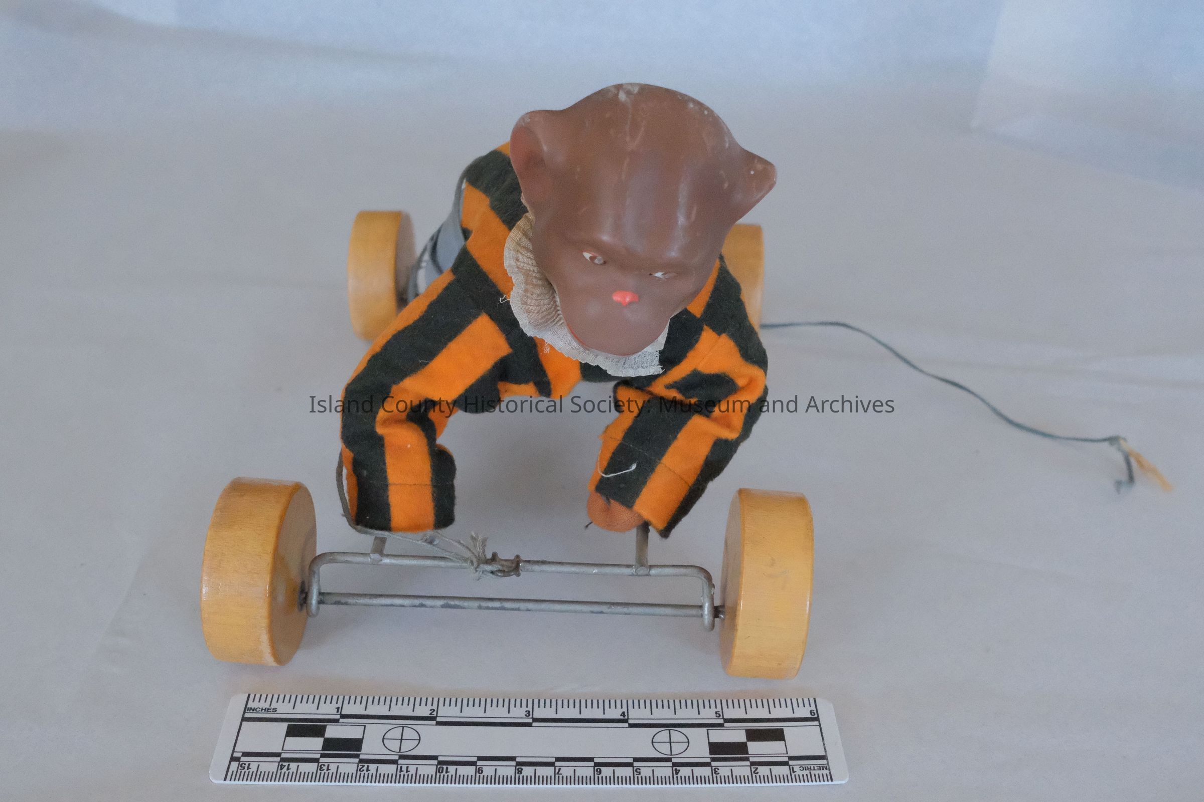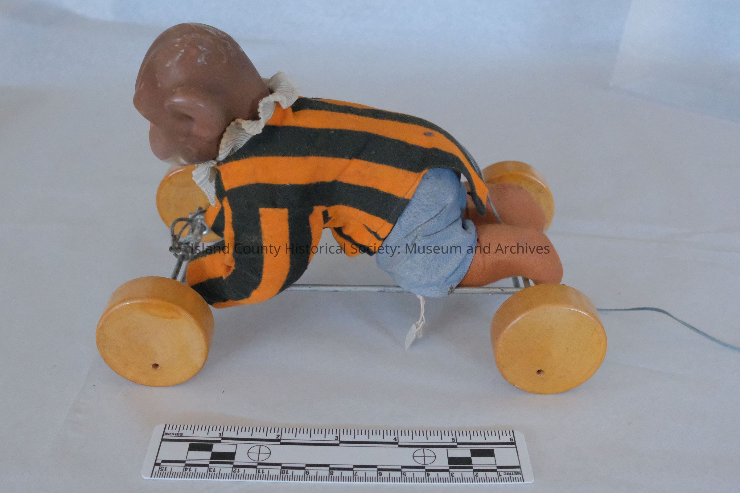 Hard rubber monkey pull toy - striped shirt and blue trousers.