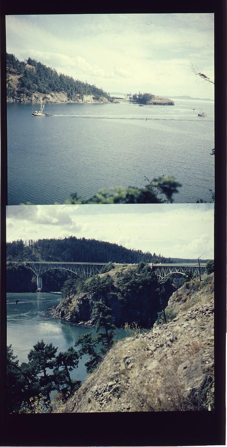Two photos. Top photo taken from Deception Pass Bridge. The main view is of Lottie Bay and Lighthouse Point. It also has a view of two boats moving through the water. The bottom photo is of Deception Pass Bridge and Pass Island. The main view is of the island, the with ocean on the right side. A rock/part of the island takes up the bottom left-hand corner. Each Photo is 2.5"x2.5"Made/Created