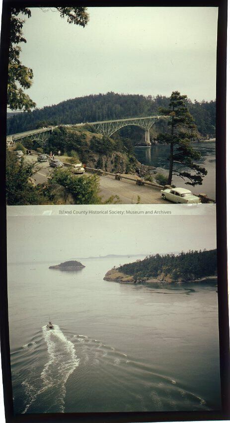 Two images. Top Image is a view of Deception Pass Bridge with 5-10 cars on it. The cars in the foreground are visable. You can also see 5-10 people in the photo. The bottom image was taken on Deception Pass Bridge and is mainly a view of the ocean. There is 1 boat moving through the water. You can see Deception Island as well. Each image is 2.5"x2.5"Made/Created
