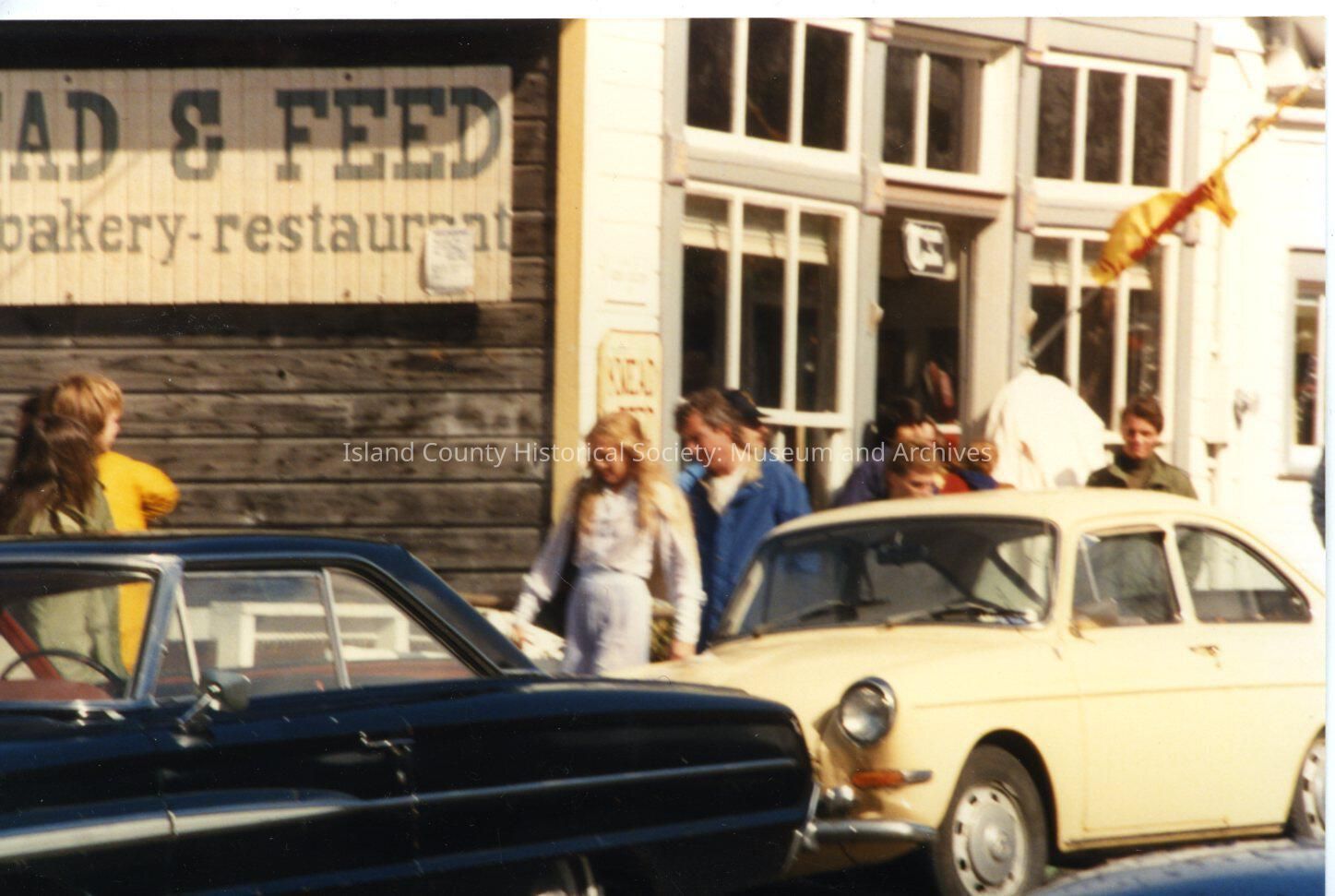Color slide of filming of The War of the Roses in Coupeville on Front Street. People walk near Knead and Feed. Cars are parked on street.