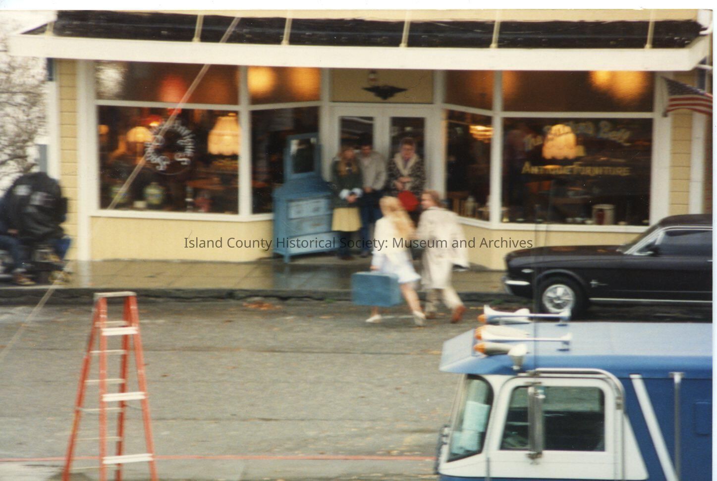 Color slide of filming of The War of the Roses in Coupeville on Front Street. Man and woman cross street in front of antique store. Woman carries suitcase. Other people huddle near doorway. Car parked to right. Ladder and truck in foreground.
