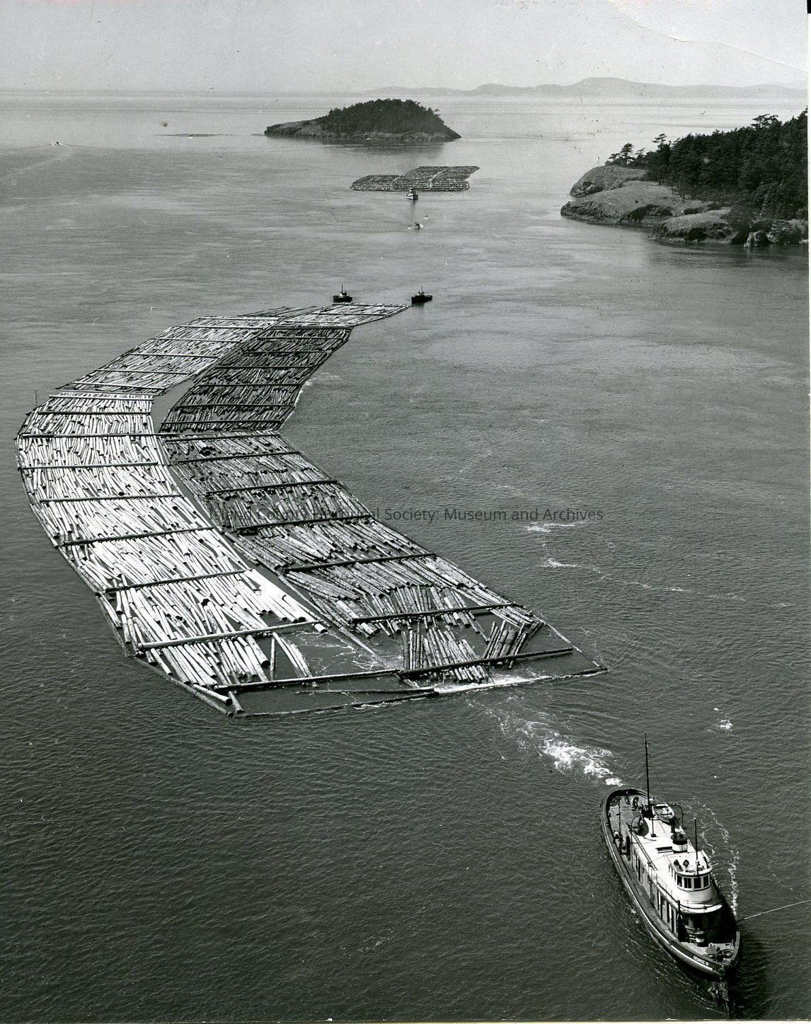 Two tugs and tows are approaching Deception Pass, 1957. Rafts can make the pass only during twice-a-day tide changes. The water stops running not more than a minute or so, but for 20 minutes before that pause and until 20 minutes afterward, it hasn't gained too much speed.Photograph Details