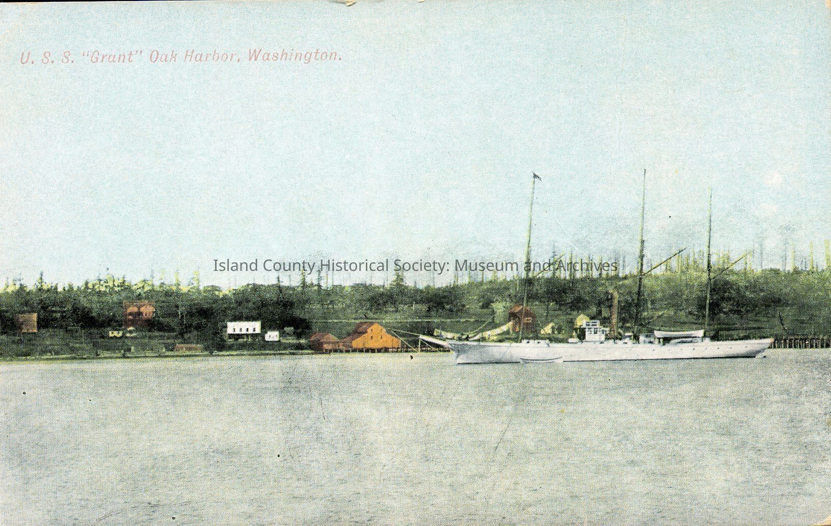 Postcard depicting the U.S.S. Grant in Oak Harbor, WA. Handwritten note from Roger Sherman on reverse reads, "L.P. Byrne Hotel, between Midway and Skagit Valley College on Pioneer Way (used to be Barrington). The buildings burned ca. 1920s so this picture is early 1900s."Collection