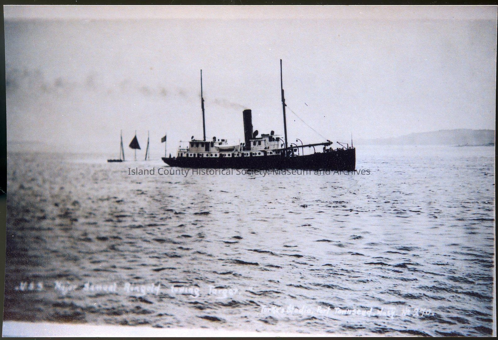 Photograph of the U.S.S. Major Samuel Ringold boat towing a target near Fort Casey. C. early 1900s. Writing on photo states, "U.S.S. Major Samuel Ringold towing target. Torka's Studio, Port Townsend, Wash., No. 270."Photograph Details
