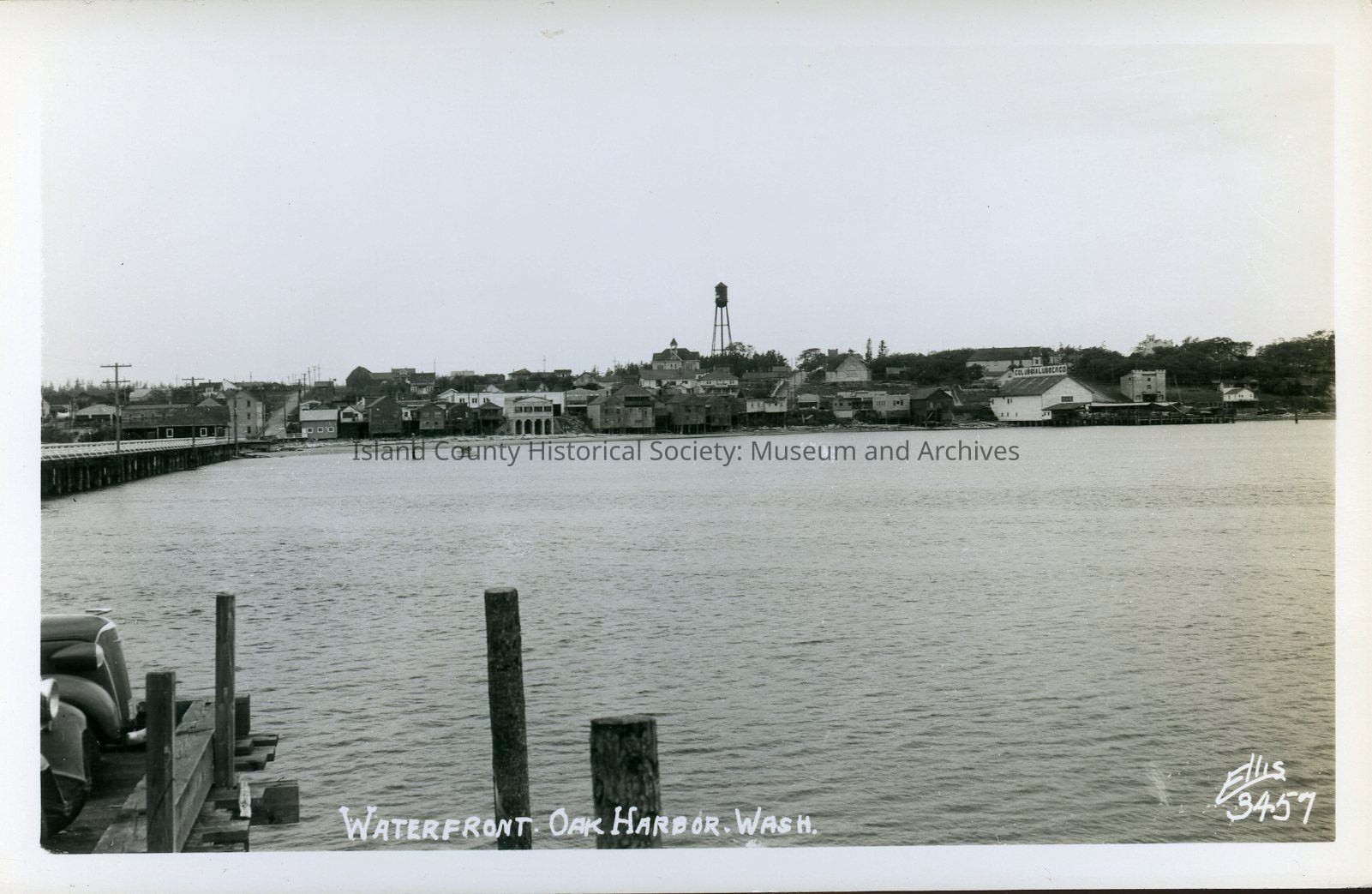 Postcard depicting the view from the side of the Washington Co-op dock in Oak Harbor, which burned in the 1960s. Photo likely c. 1940s. Photo by Ellis.Collection