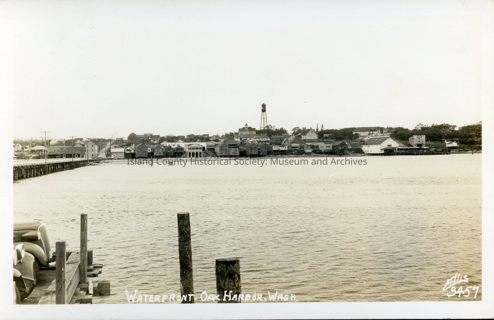 Postcard depicting the view from the side of the Washington Co-op dock in Oak Harbor, which burned in the 1960s. Photo likely c. 1940s. Photo by Ellis.