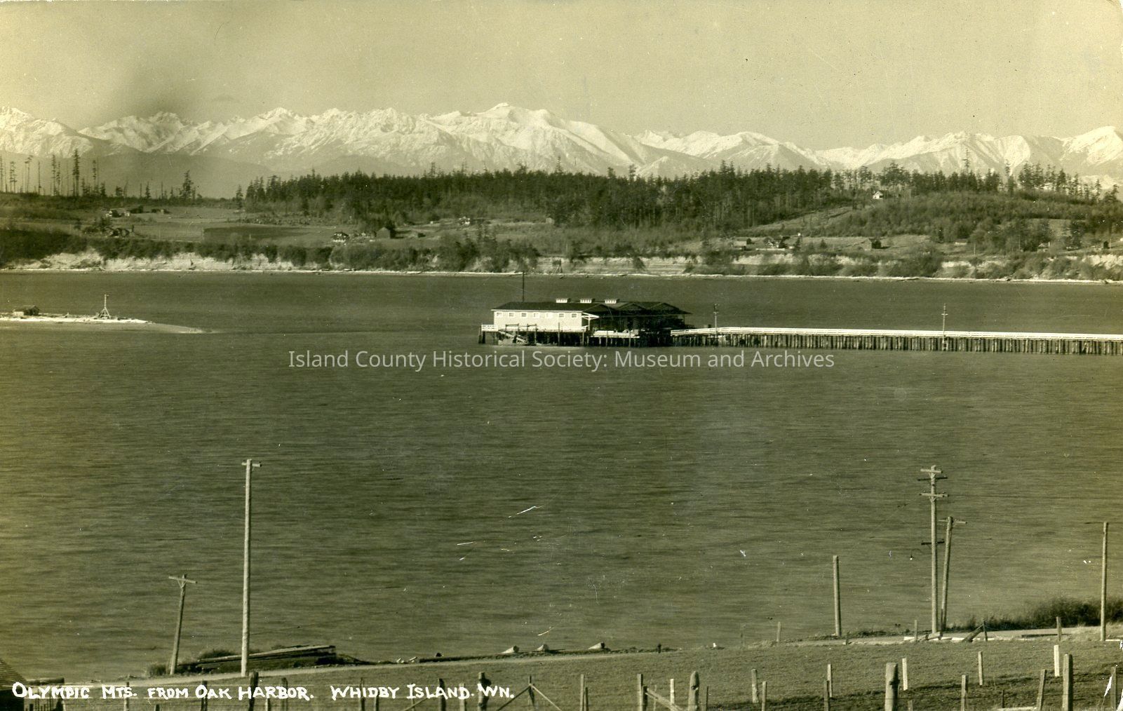 Postcard depicting a view of the Olympic Mountain Range and the Washington Co-op dock (which burned in the 1960s) in Oak Harbor. Handwritten note from Roger Sherman on reverse reads, "Pic is prior to 1941 because the spit is still there."Collection