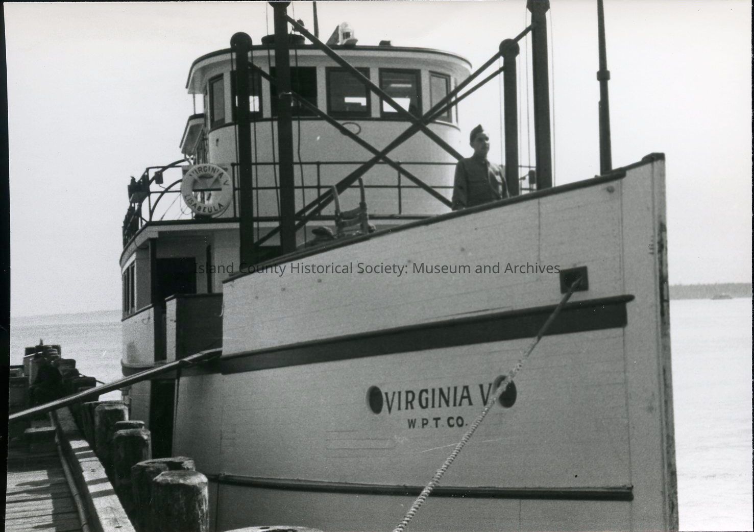 Photograph of the Virginia V at Quartermaster's dock, Fort Casey. Built 1921. This boat is the last operational example of a Puget Sound mosquito fleet steamer. The "W.P.T. CO." on the boat's side stands for "West Pass Transportation Co." Built in Maplewood, Washington, the boat measures 125 ft. by 24 feet. It weighs about 150 tons, with a gross weight of 99 tons, and a net weight of 67 tons.Photograph Details
