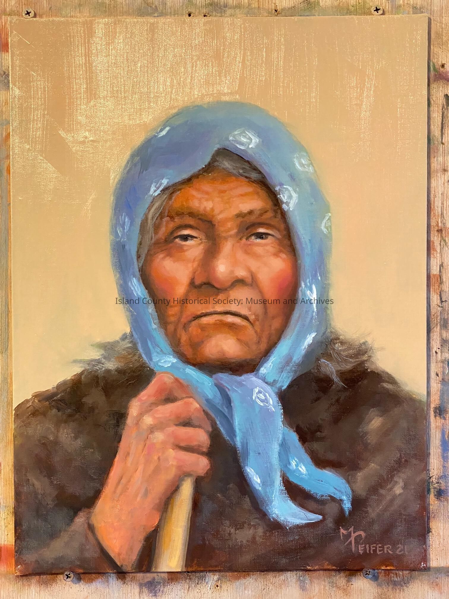 Oil painting done by local artist Mel Peifer, based off of archival images of Walalita Slapoose, painted specifically for the museum to display.Type of Painting
