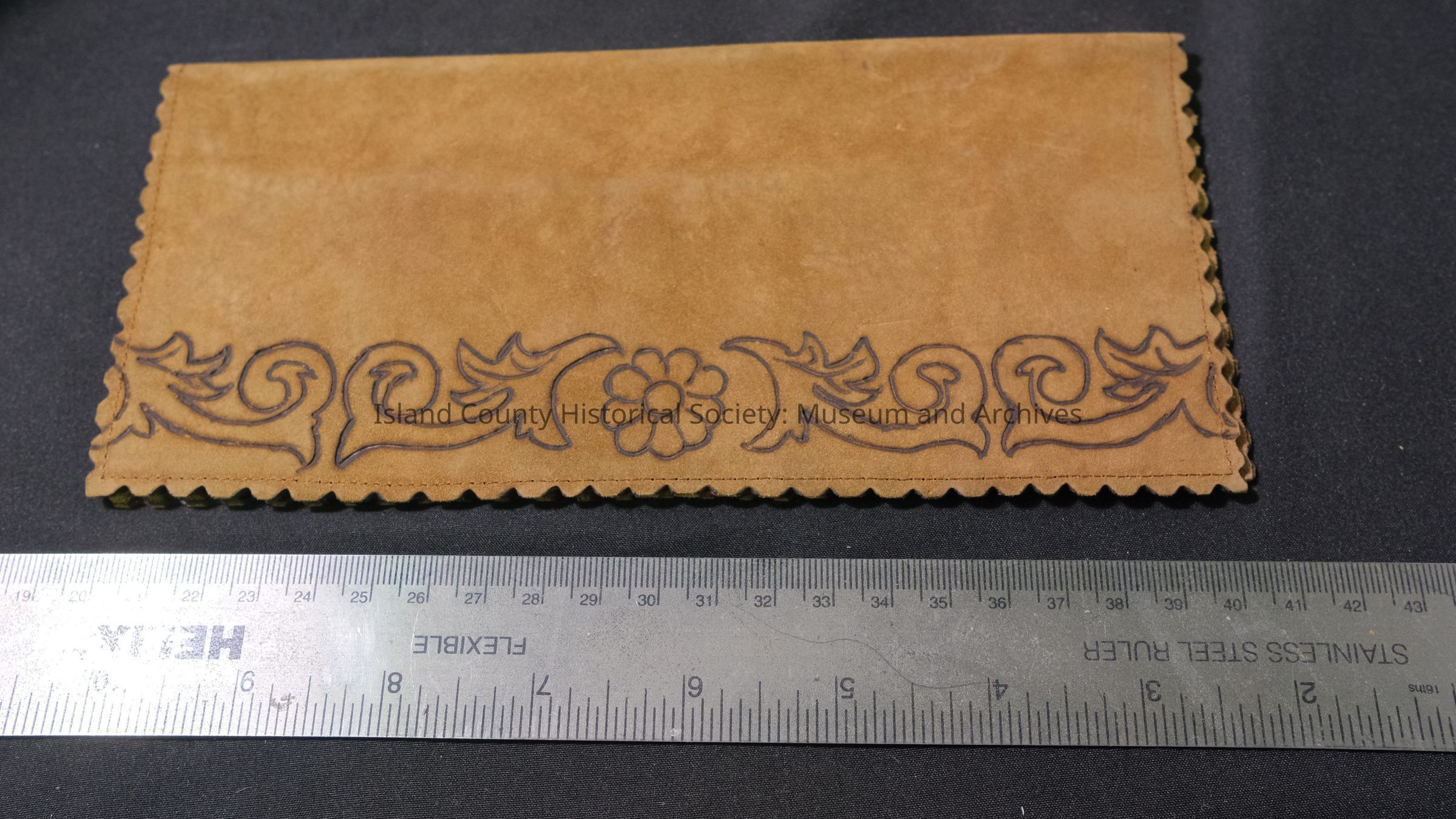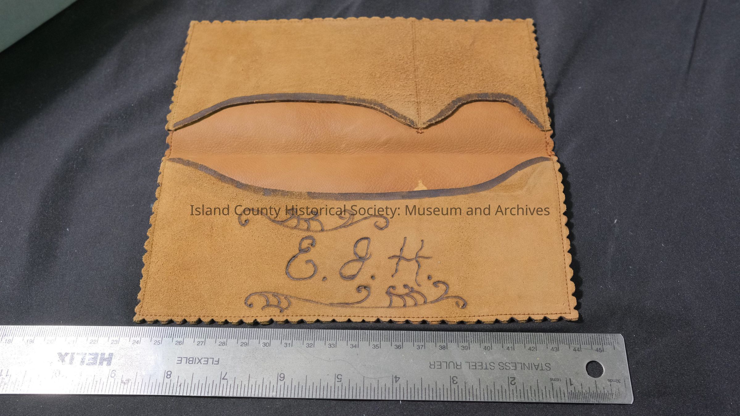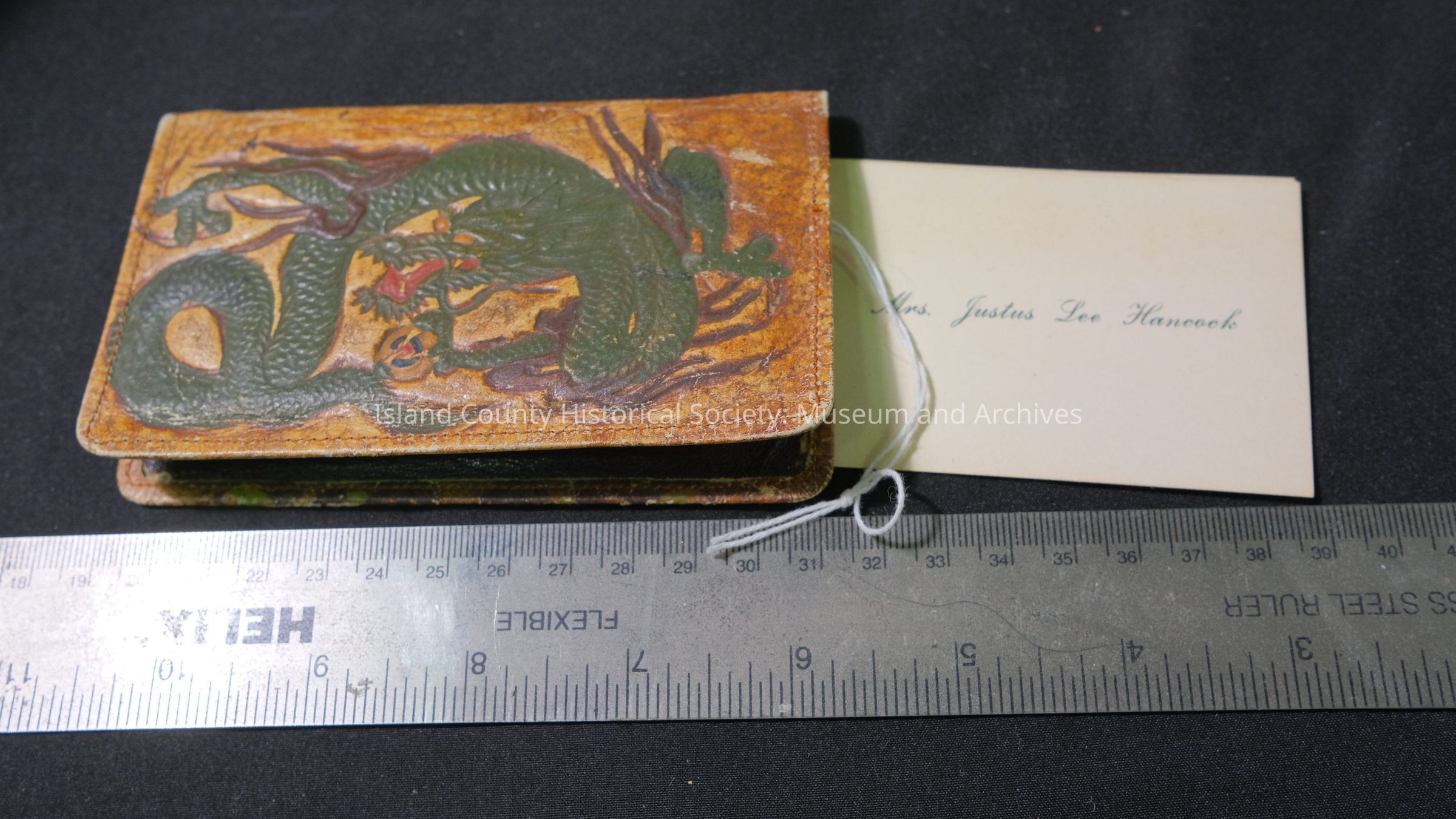 Leather billfold, handmade, E.J.H. (handwritten in orginal catalog "Ernest Justus Hancock, her grandfather") Leather wallet with green dragon design contains cards for "Mrs. Justus Lee Hancock"