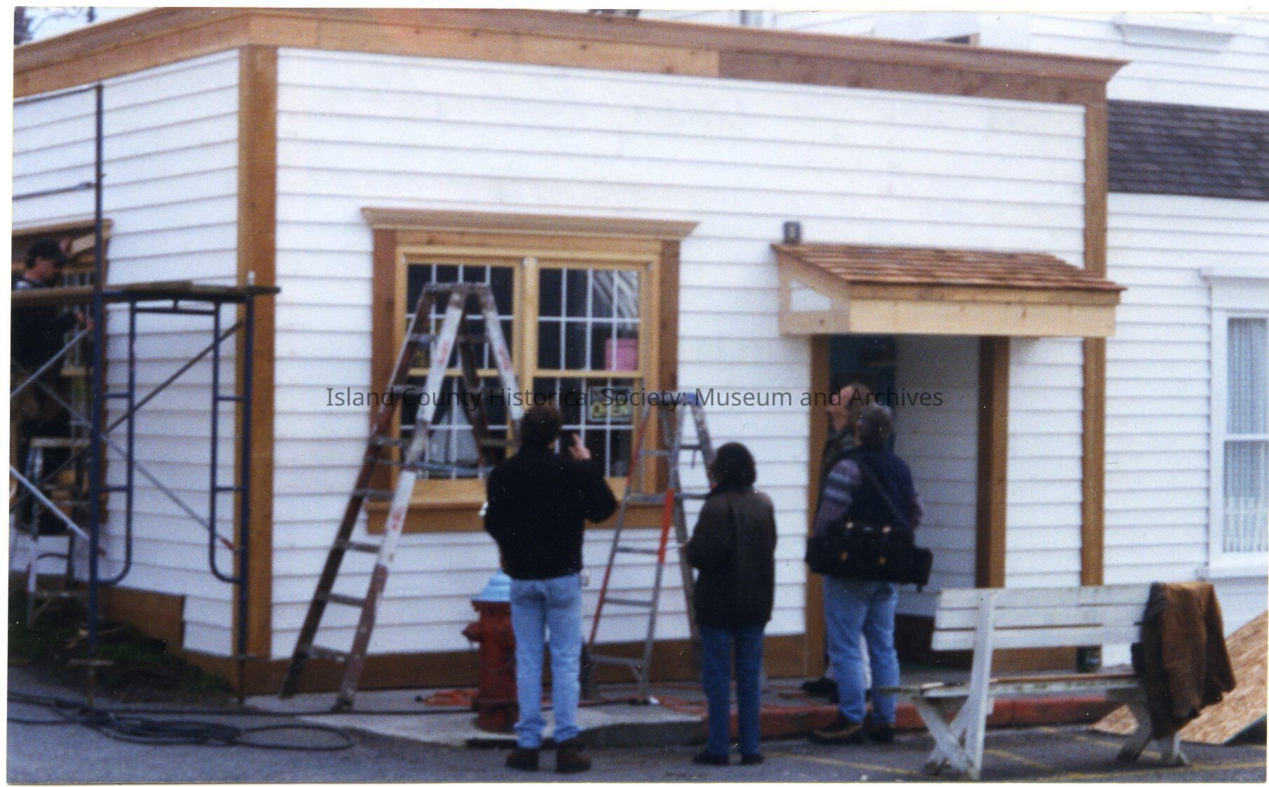 Photo during the filming of "War of the Roses" in 1989. Four people are looking at the adjustments to the "Touch of Dutch" building. Siding, portico, framing around the windows, etc. On the back: Casing put over the cinder-block bldg by MGM for the movie, April -98 (filmed in 1989).